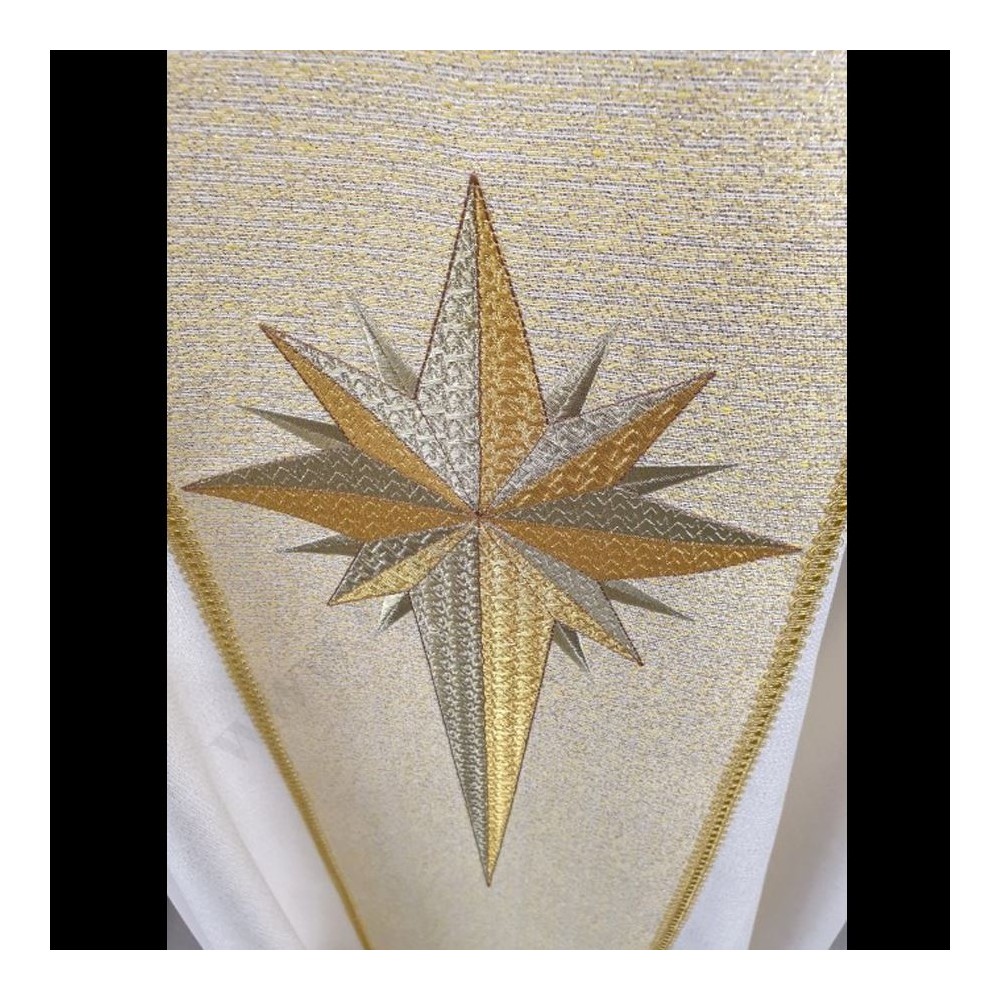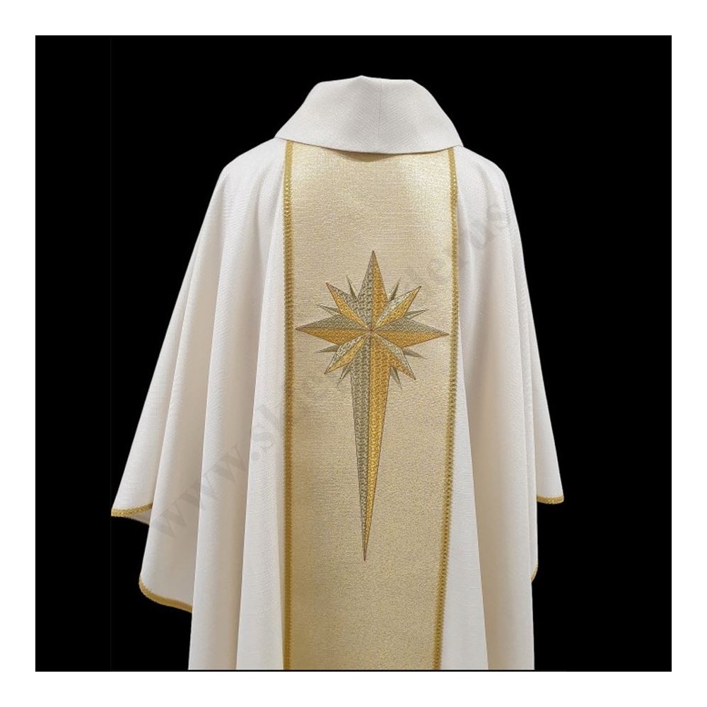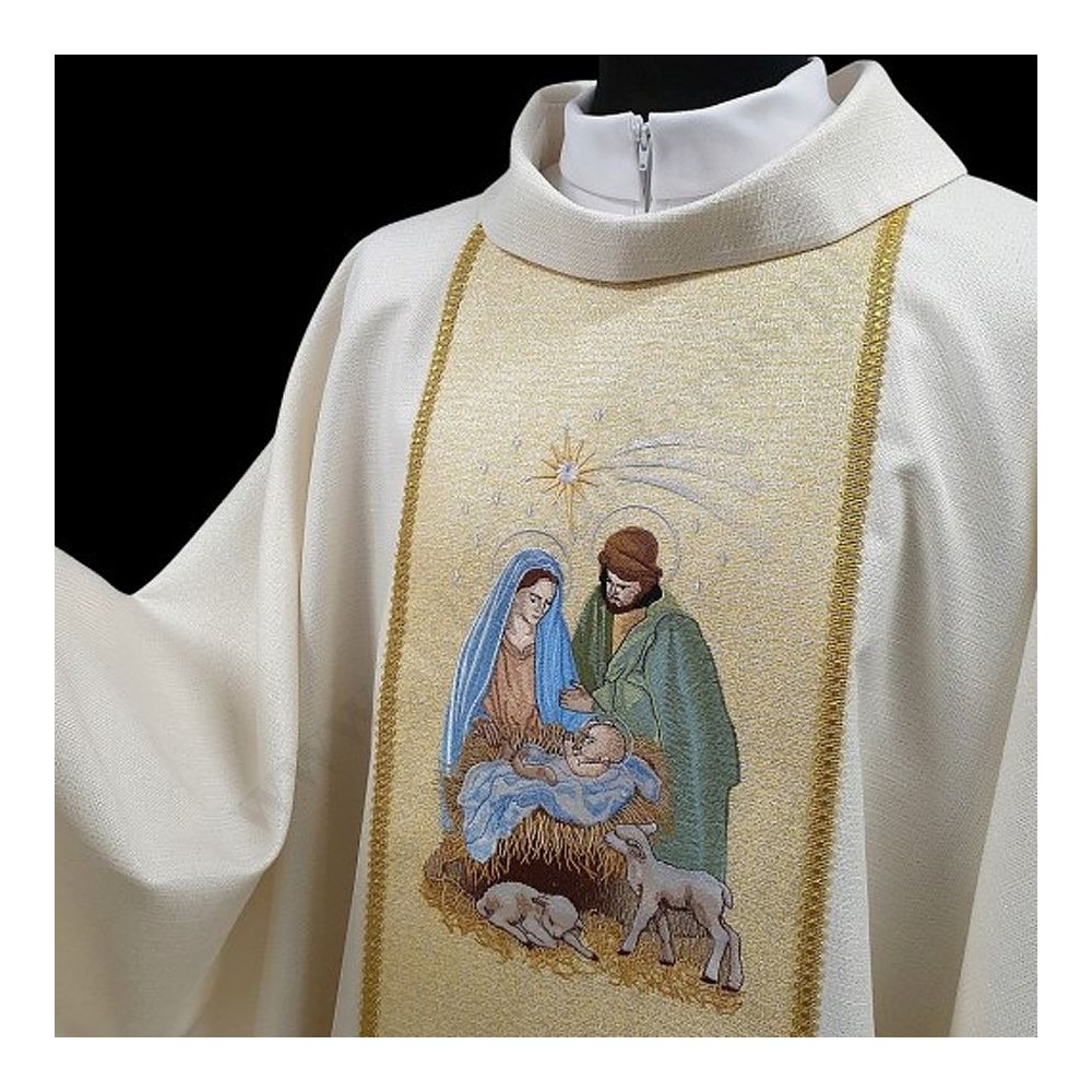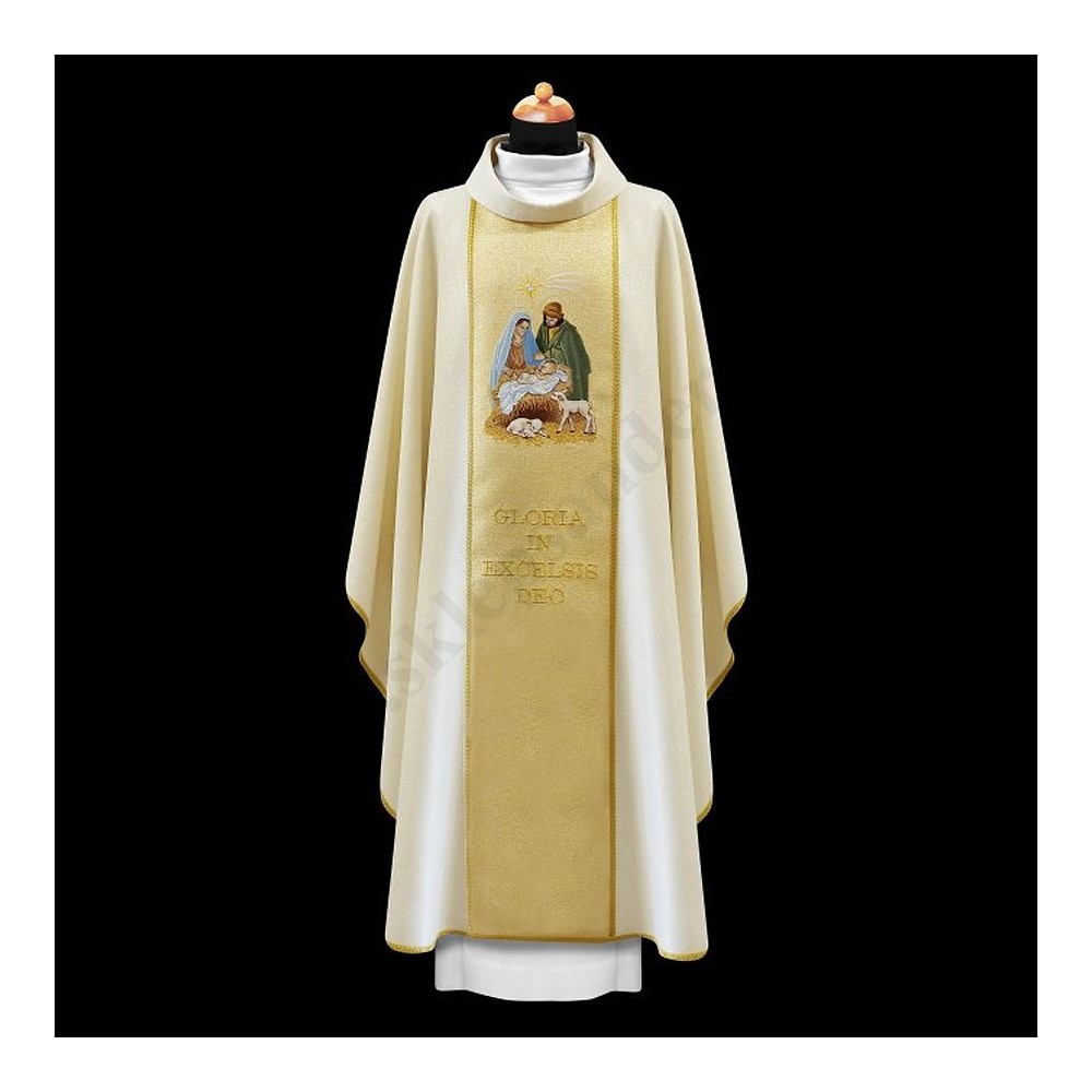 Ornat haftowany Boże Narodzenie, uszyty w stylu monastycznym z kremowej tkaniny z przetykaną srebrną nicią.