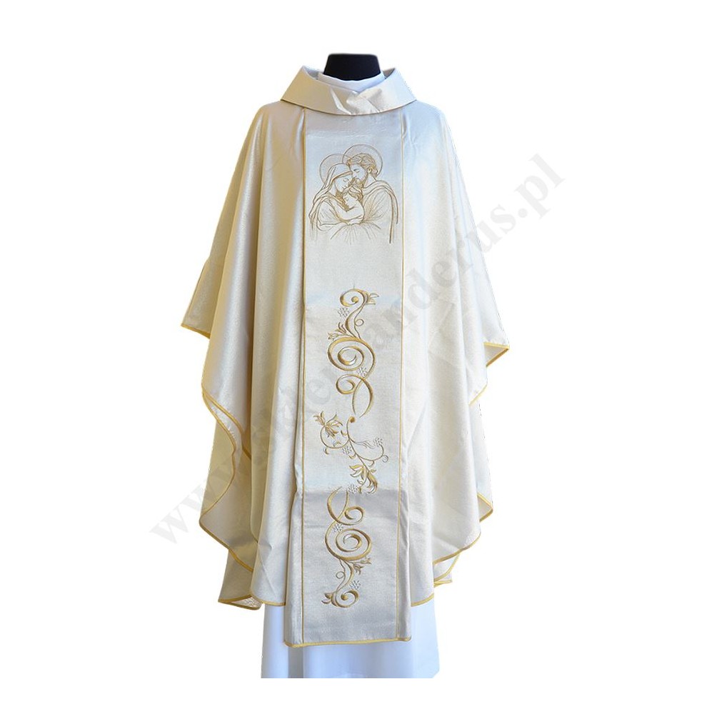 Ornat z wyhaftowanym wizerunkiem Świętej Rodziny oraz motywami florystycznymi.