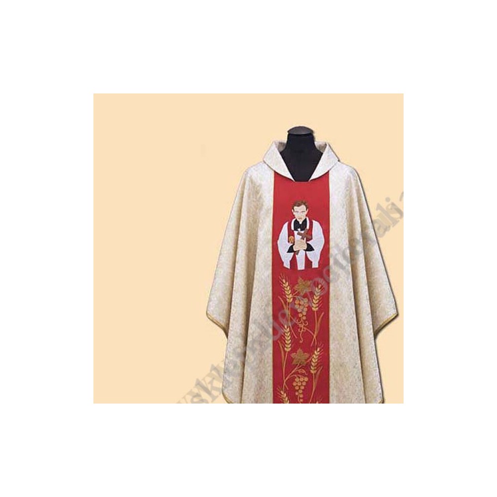 Ornat z materiału imitującego złoto, pas haftowany motywami eucharystycznymi, na pasie wyhaftowany jest również wizerunek Bł. Ks. Popiełuszko