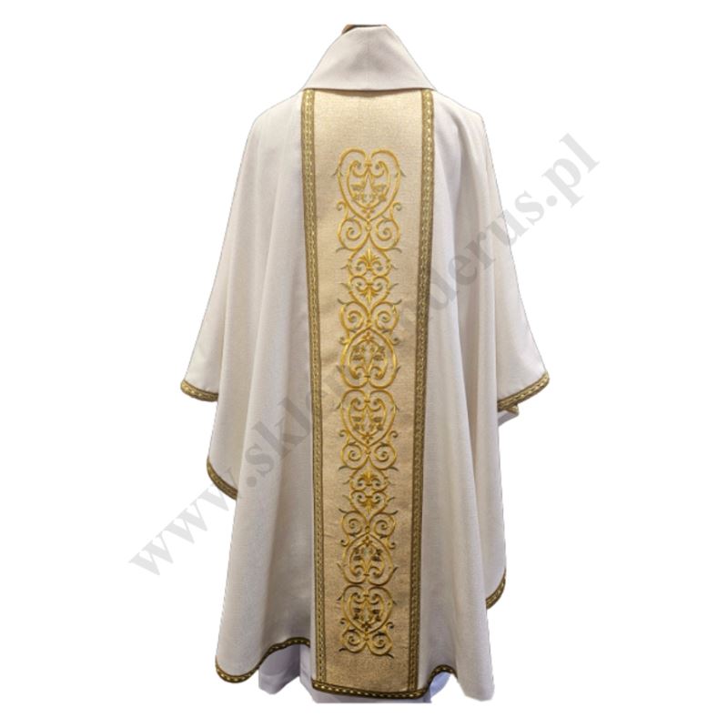 Ornat kapłański haftowany ozdobiony haftowanym wizerunkiem Św. Charbela. Całość ozdobiona bogatym haftem na pasie złotym. Szata liturgiczna uszyta z tkaniny kremowej z nicią złotą ozdobnej i wykończona złotą szlachetną pasmanterią. Do kompletu stuła haftowana. Tył ornatu również bogato zdobiony złotym ornamentem. Idealna szata na uroczyste ceremonie liturgiczne, emanująca wyjątkowym stylem i elegancją.