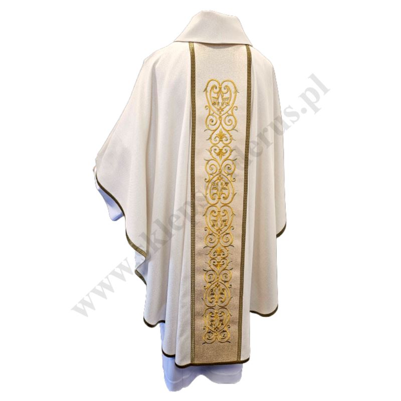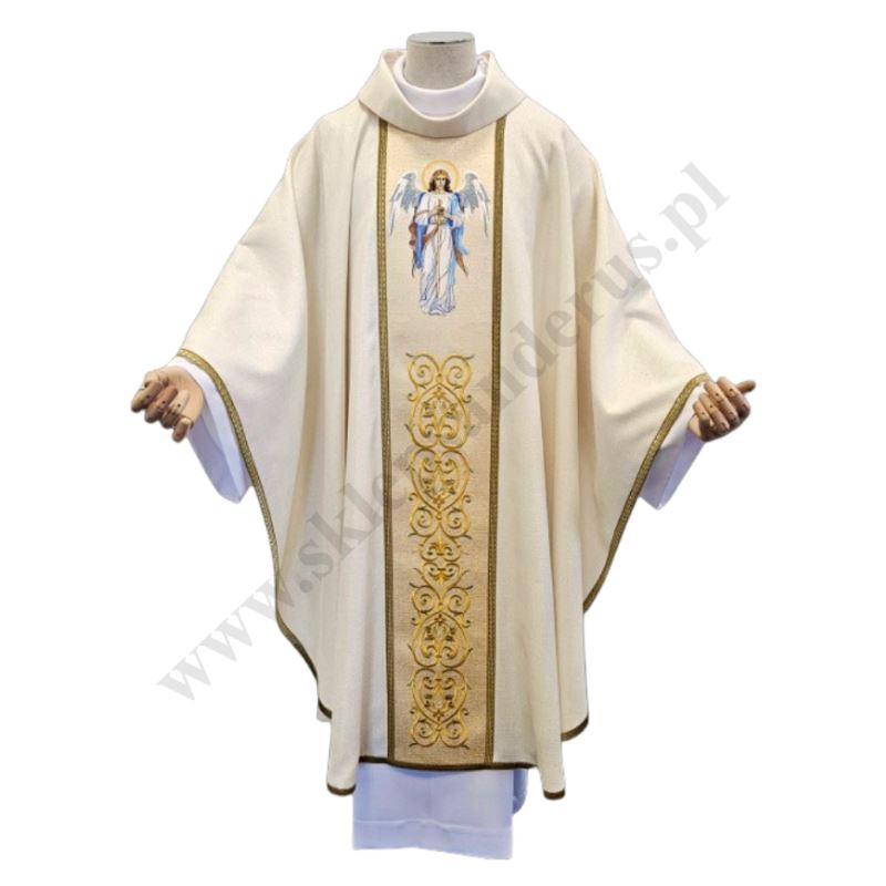 Ornat kapłański haftowany ozdobiony haftowanym wizerunkiem Michała Archanioła. Całość ozdobiona bogatym haftem na pasie złotym. Szata liturgiczna uszyta z tkaniny kremowej z nicią złotą ozdobnej i wykończona złotą szlachetną pasmanterią. Do kompletu stuła haftowana. Tył ornatu również bogato zdobiony złotym ornamentem. Idealna szata na uroczyste ceremonie liturgiczne, emanująca wyjątkowym stylem i elegancją.