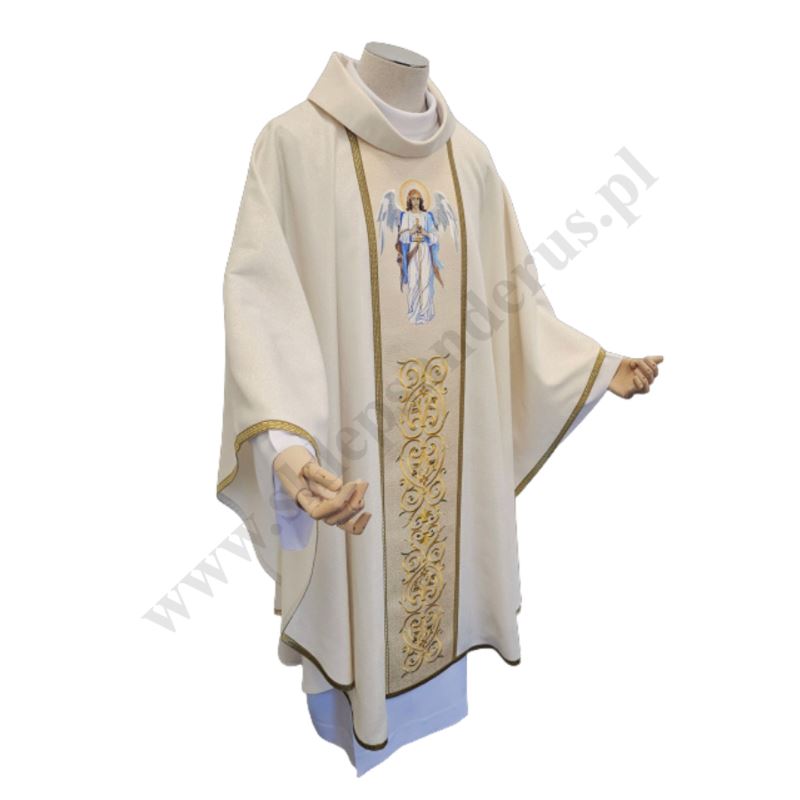 Ornat kapłański haftowany ozdobiony haftowanym wizerunkiem Michała Archanioła. Całość ozdobiona bogatym haftem na pasie złotym.
