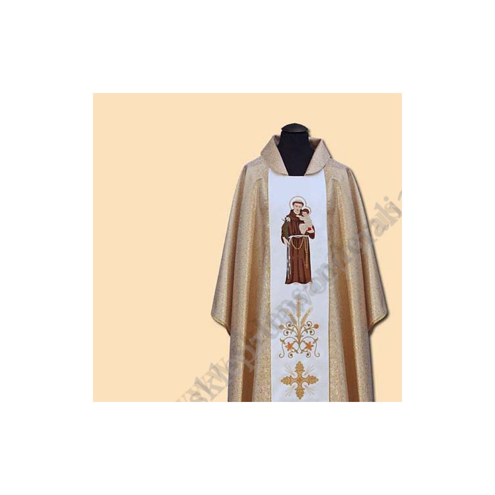 Ornat z materiału imitującego złoto, pas haftowany motywami eucharystycznymi, na pasie wyhaftowany jest również wizerunek Świętego Antoniego