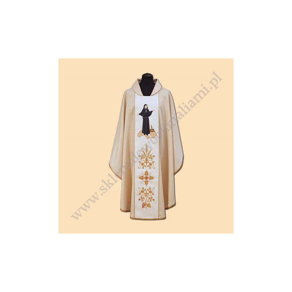 Ornat z materiału imitującego złoto, pas haftowany motywami eucharystycznymi, na pasie wyhaftowany jest również wizerunek Świętej Faustyny