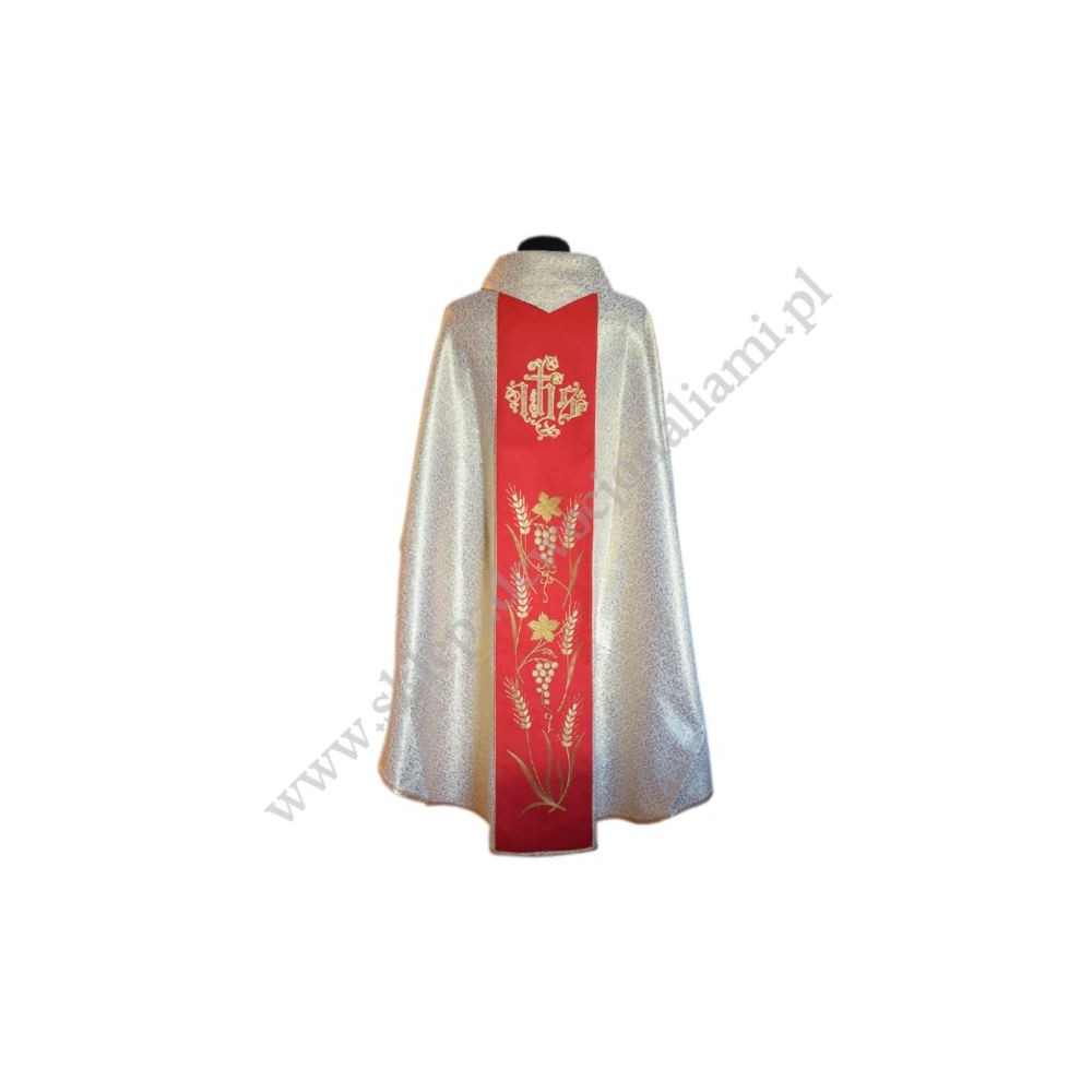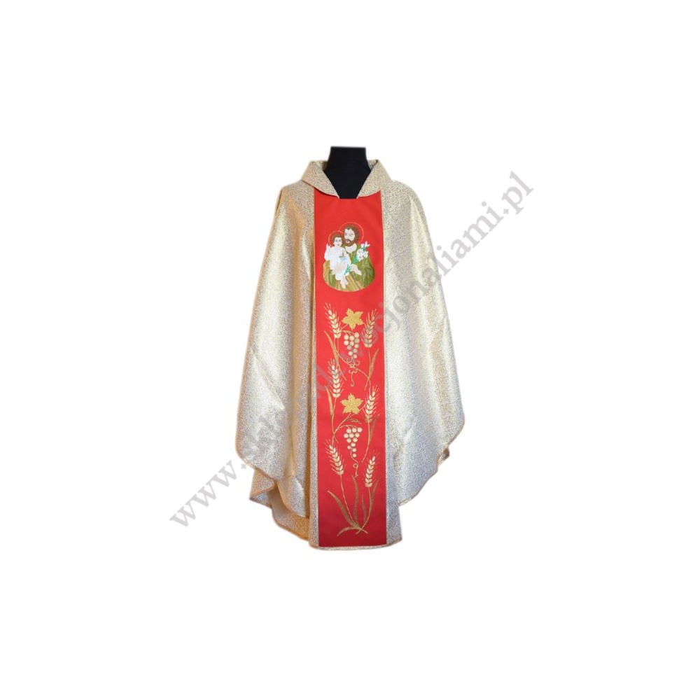 Ornat z materiału imitującego złoto, pas haftowany motywami eucharystycznymi, na pasie wyhaftowany jest również wizerunek Świętego Józefa