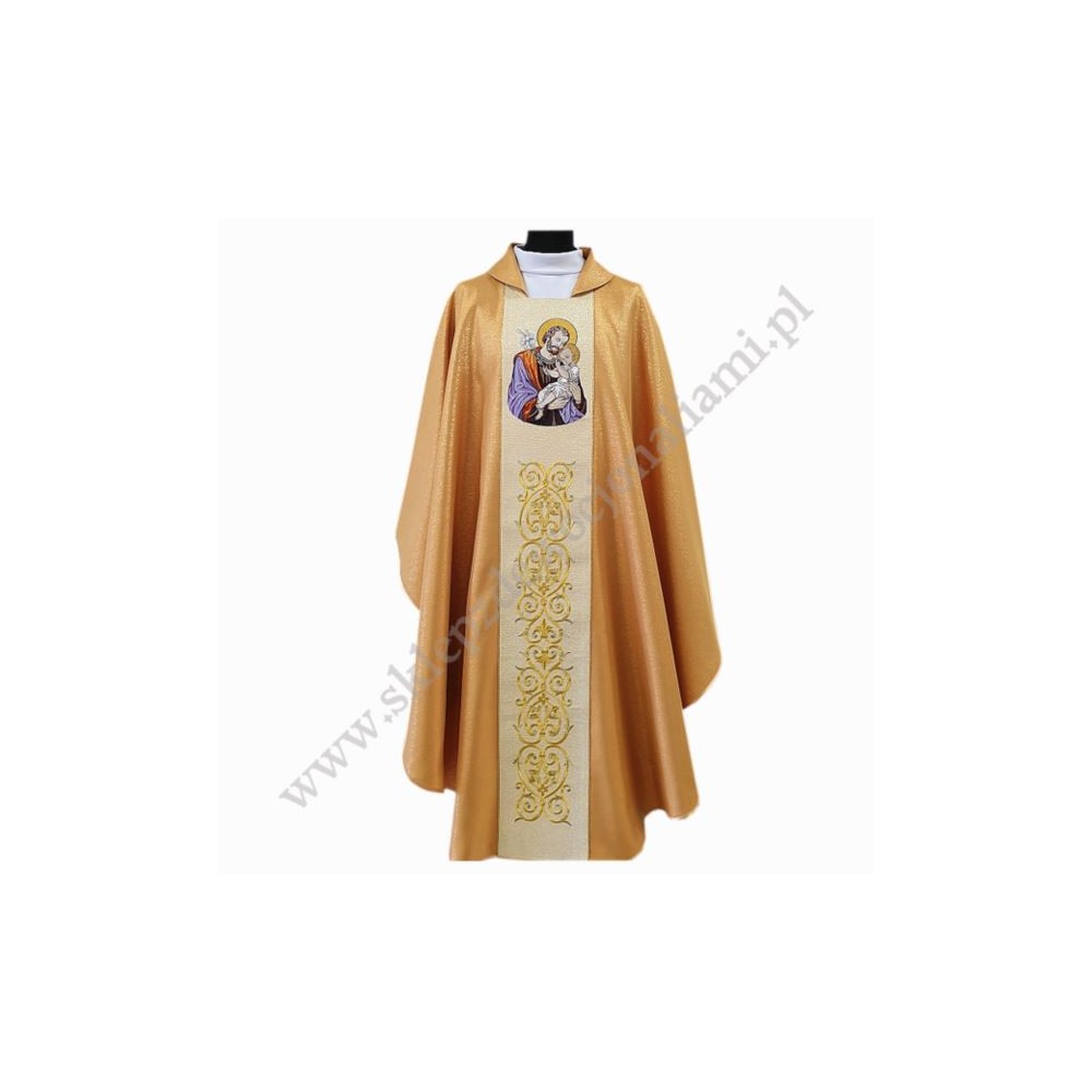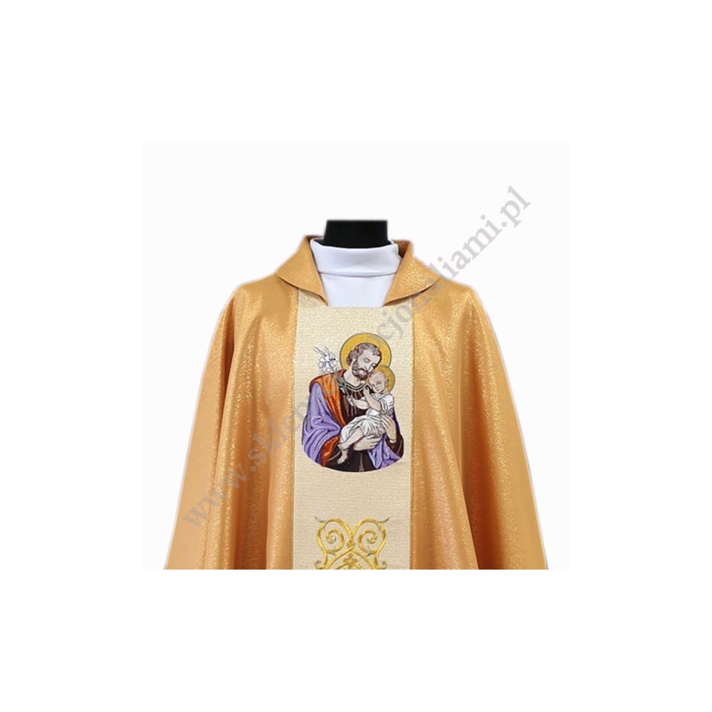 Ornat uszyty z tkaniny brokatowej z haftowanym wizerunkiem Św. Józefa.