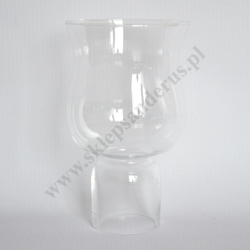 Szklany klosz do świecy o wysokości 16.5 cm, dolna średnica wewnętrzna 4.7 cm, górna średnica wewnętrzna 9.7 cm.