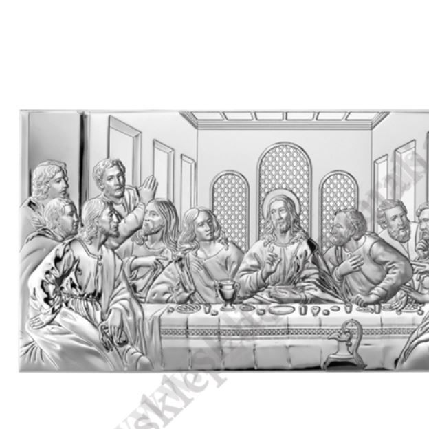 Srebrny obrazek z wizerunkiem Ostatniej Wieczerzy. Obrazek jest z możliwością postawienia lub powieszenia. Szerokość obrazka 26 cm, wysokość obrazka 15 cm.