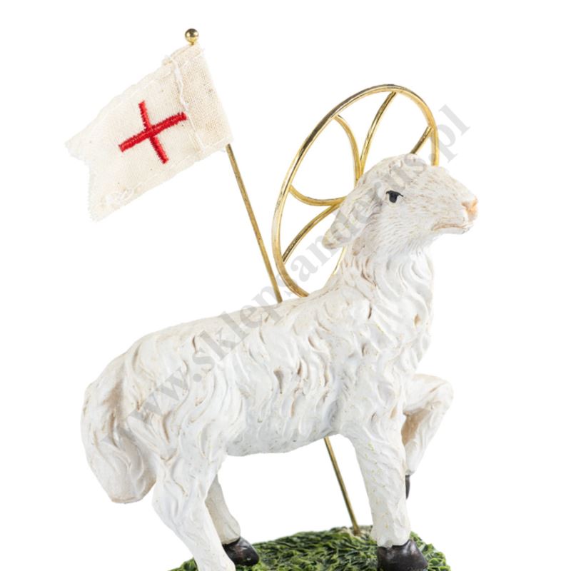Baranek wielkanocny stojący o wysokości 13 cm wykonany z żywicy i metalu.