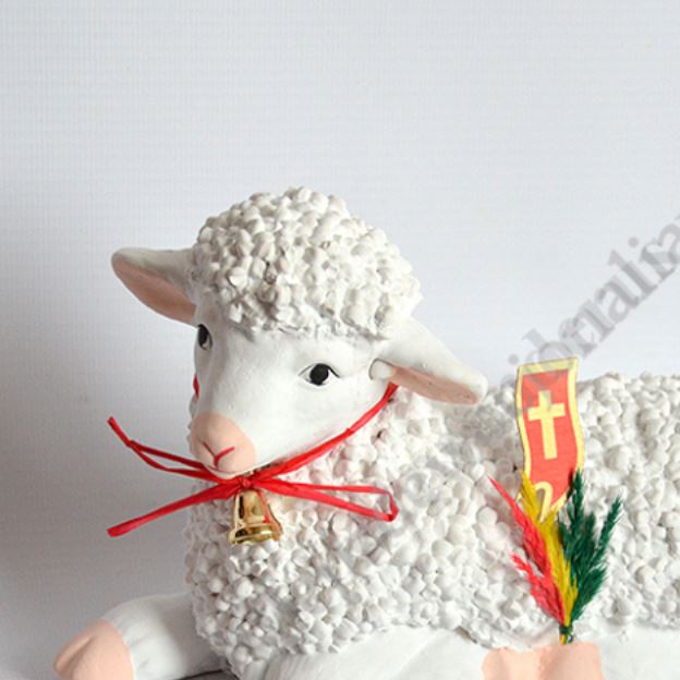 Baranek wielkanocny gipsowy o wysokości 13 cm i szerokości 19 cm.