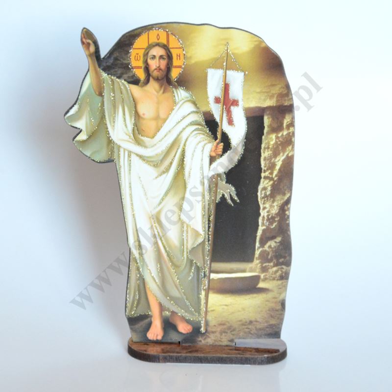 Statuetka Chrystusa Zmartwychwstałego o wysokości 10.4 cm i szerokości 7 cm wykonana z drewnopodobnego materiale HDF.