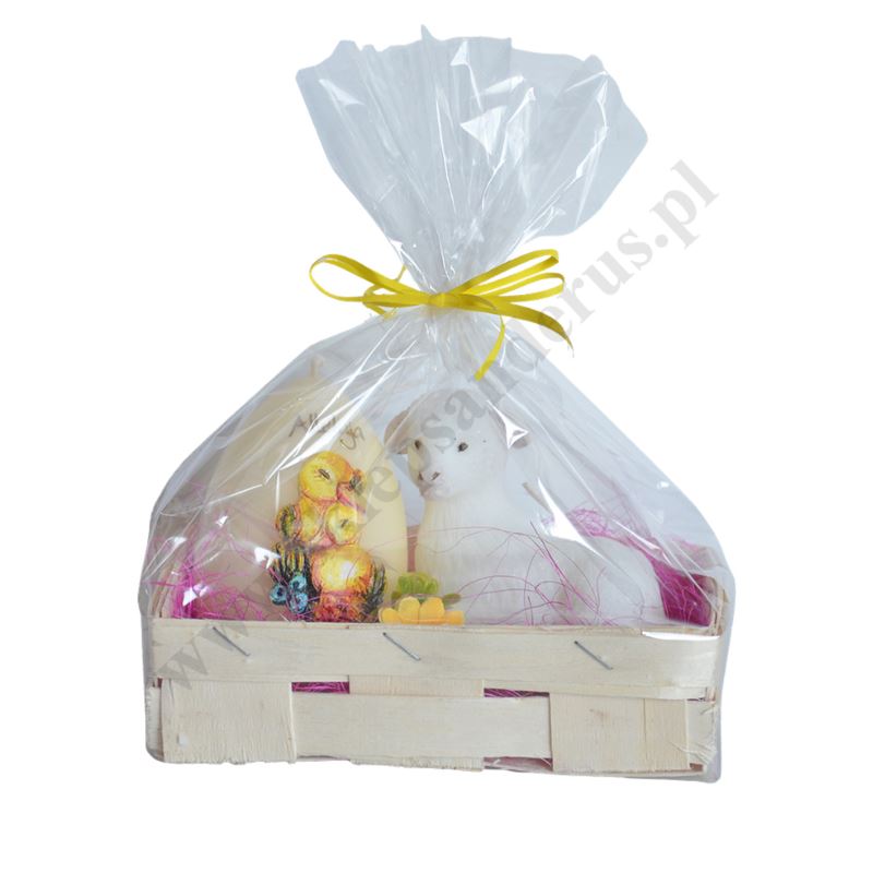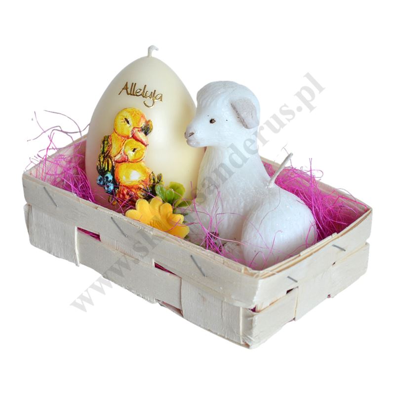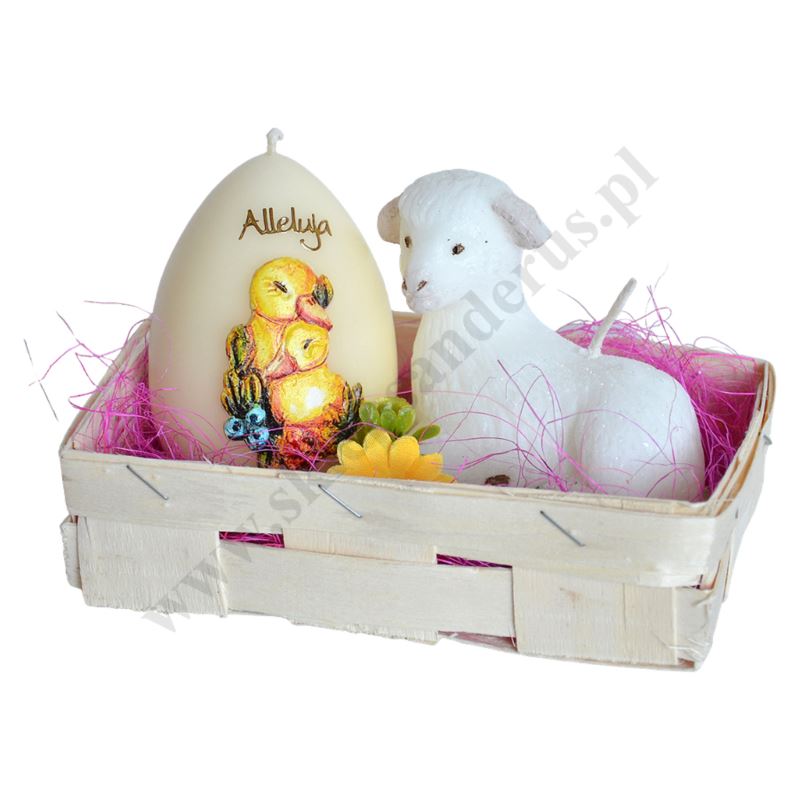 Wielkanocny koszyczek ozdobny zawierający świece w kształcie baranka oraz pisanki. Szerokość koszyka 16 cm, głębokość koszyka 9 cm, wysokość całości 10 cm.