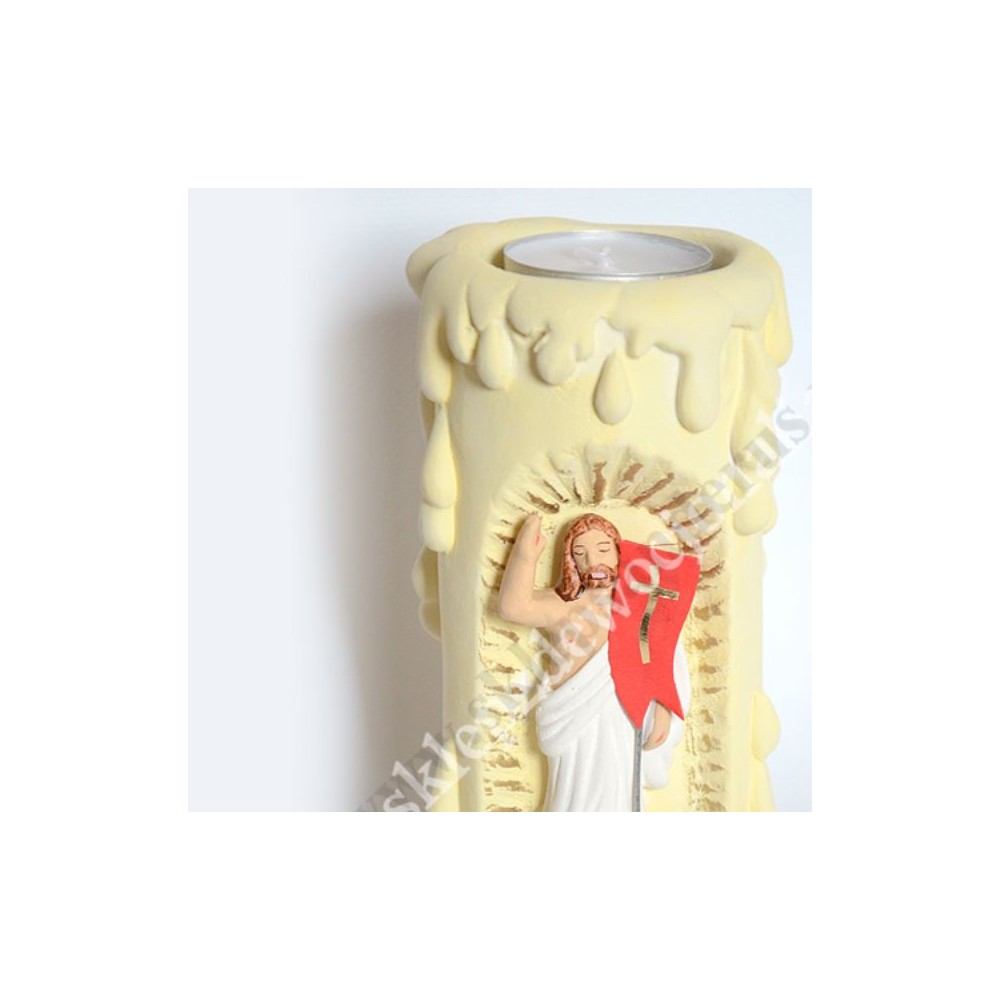 Wielkanocna ozdoba świąteczna zdobiona postacią Jezusa Zmartwychwstałego, w postaci podstawki na podgrzewacz, wykonana z gipsu o wysokości 13 cm i średnicy 8 cm