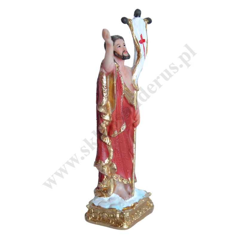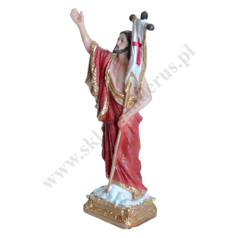 Figurka Pana Jezusa Zmartwychwstałego o wysokości 13 cm i szerokości 6 cm, wykonana z żywicy.