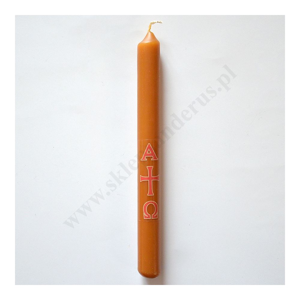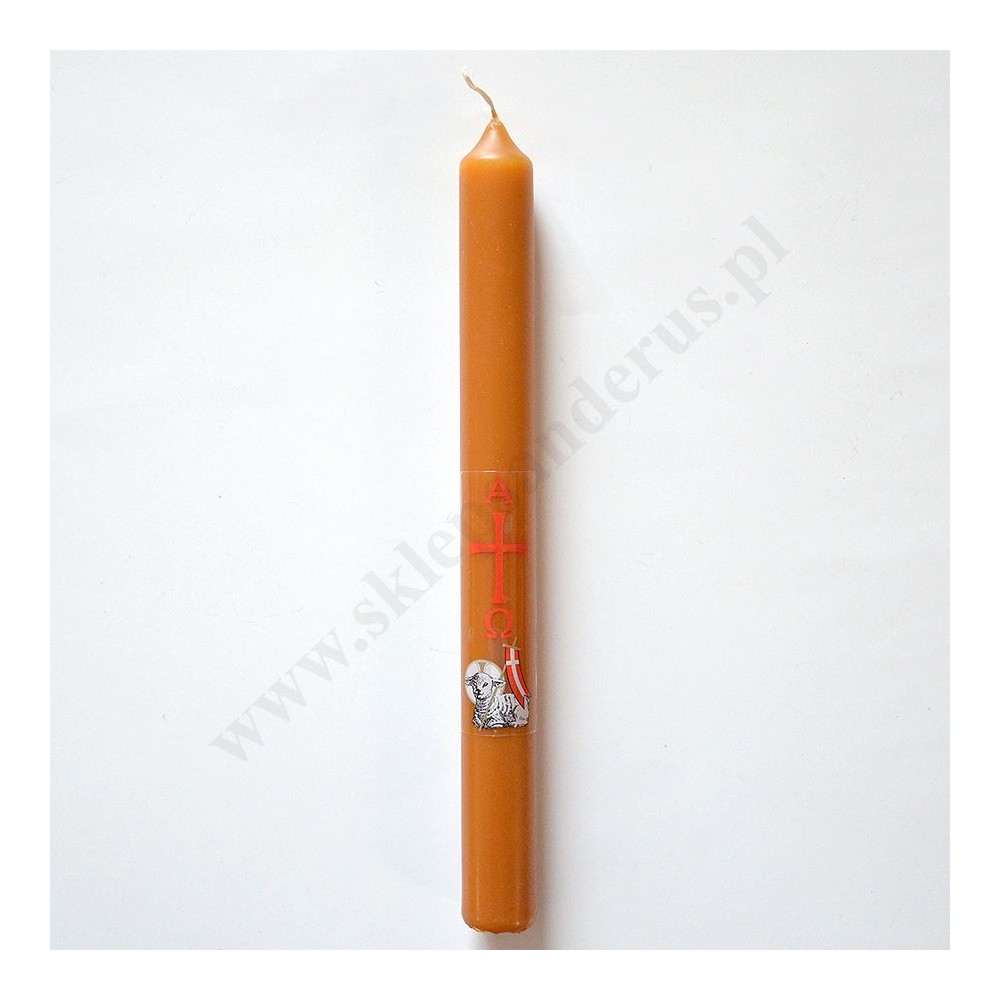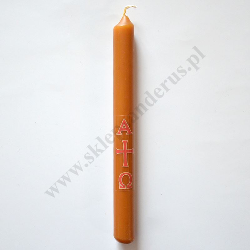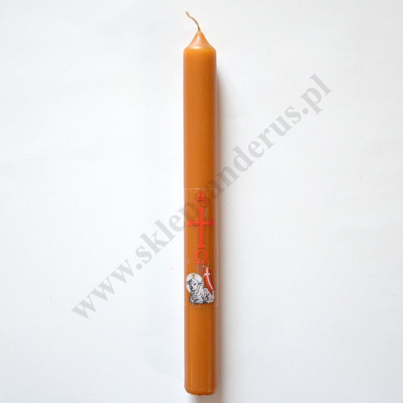 Paschalik wielkanocny parafinowo-woskowy o wysokości 23 cm i średnicy 2.4 cm. Sprzedaż w miksie wzorów.