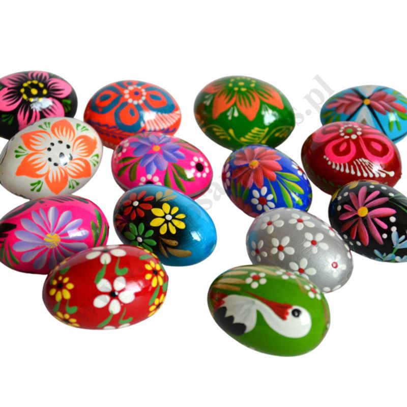Drewniana pisanka ręcznie malowana o wysokości 6 cm. Sprzedaż w miksie wzorów.