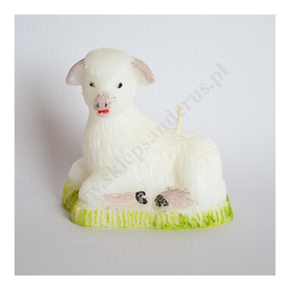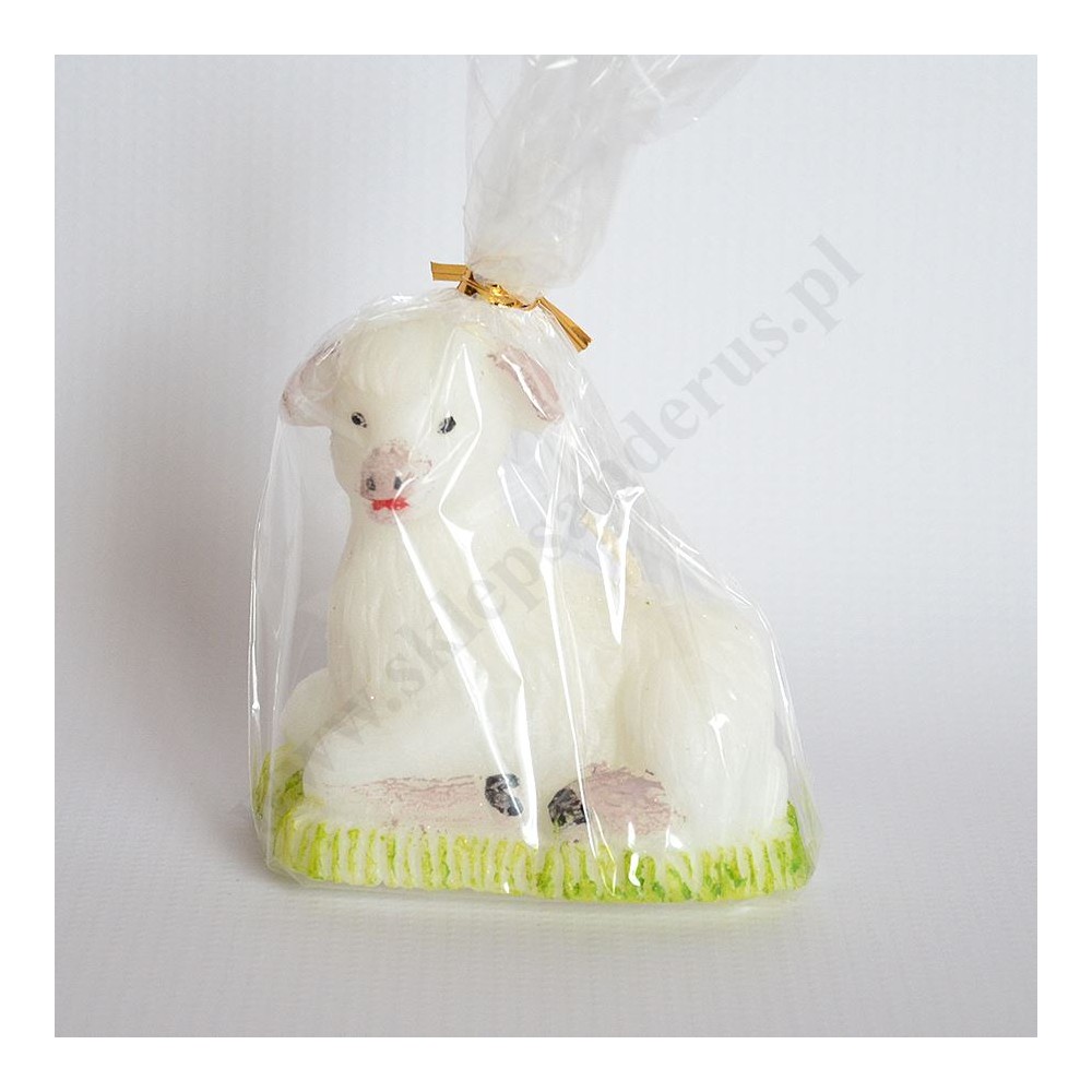 Świeca ozdobna w kształcie baranka wielkanocnego o wysokości 9 cm i szerokości 9.5 cm, zapakowana w celofanowy woreczek.