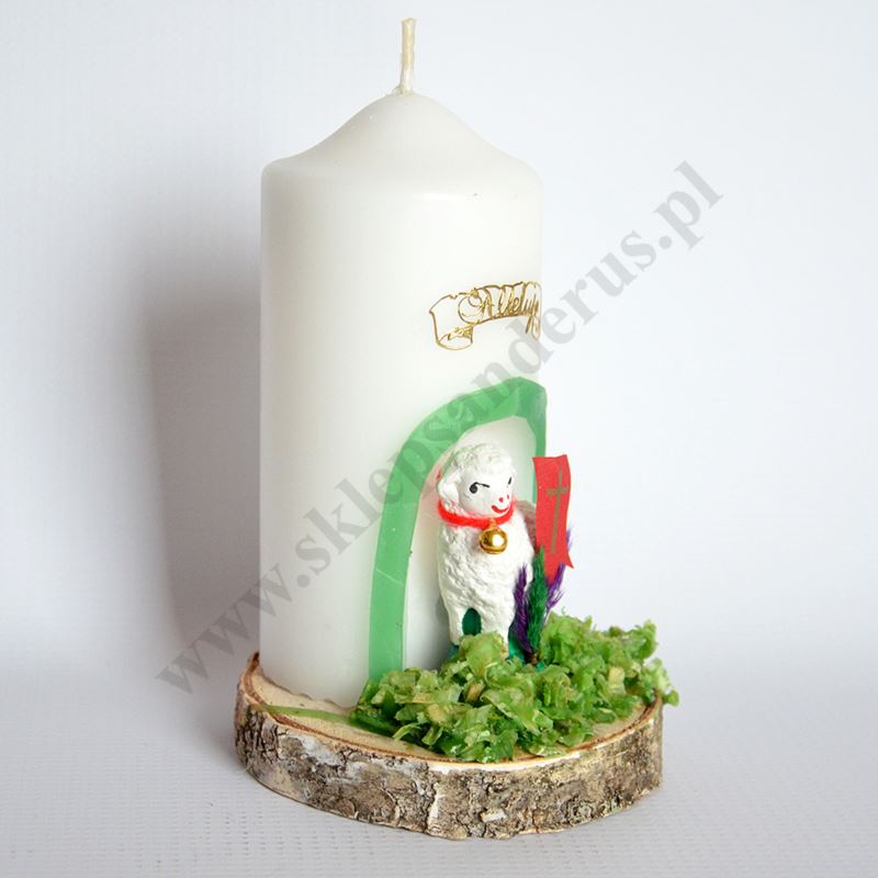 Świeca parafinowa ozdobna z barankiem wielkanocnym. Wysokość świecy 15 cm i średnica w podstawie ok. 10 cm. Świeca charakteryzuje się tym, że oprócz tradycyjnego płomienia oświetla naprzemiennie poprzez światłowód umieszczony wewnątrz świecy figurkę...