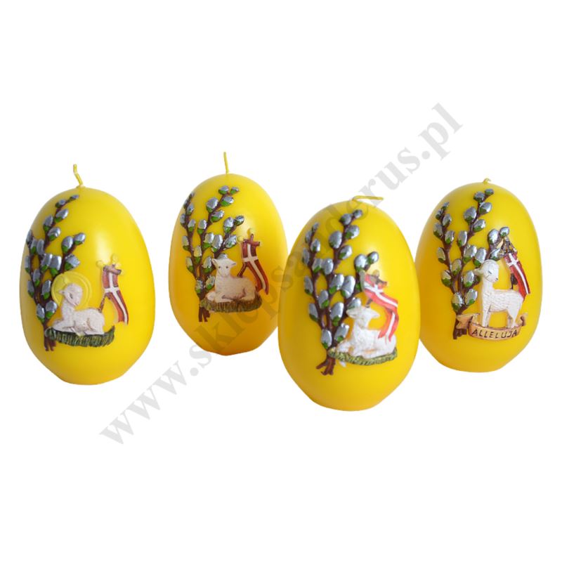 Świeca pisanka zdobiona przestrzenną aplikacją. Wysokość świecy 12 cm, średnica 8 cm. Sprzedaż w miksie wzorów.