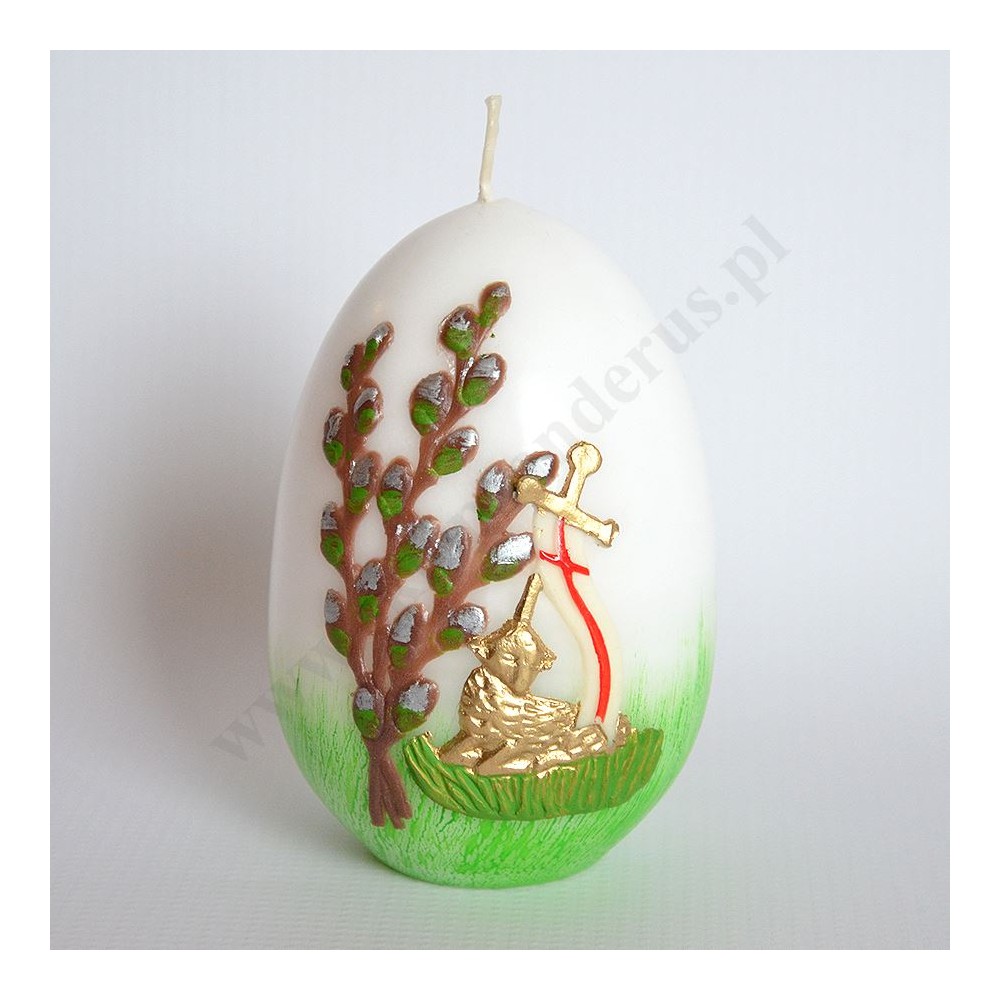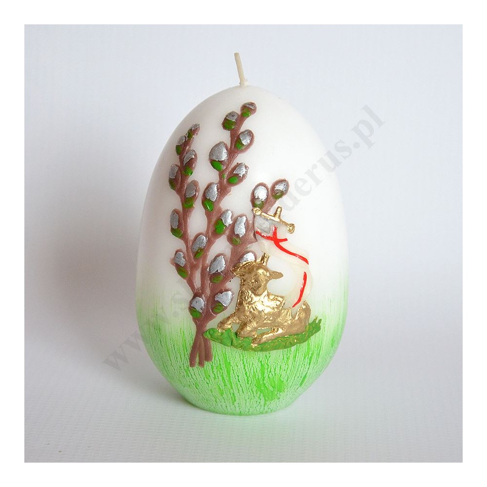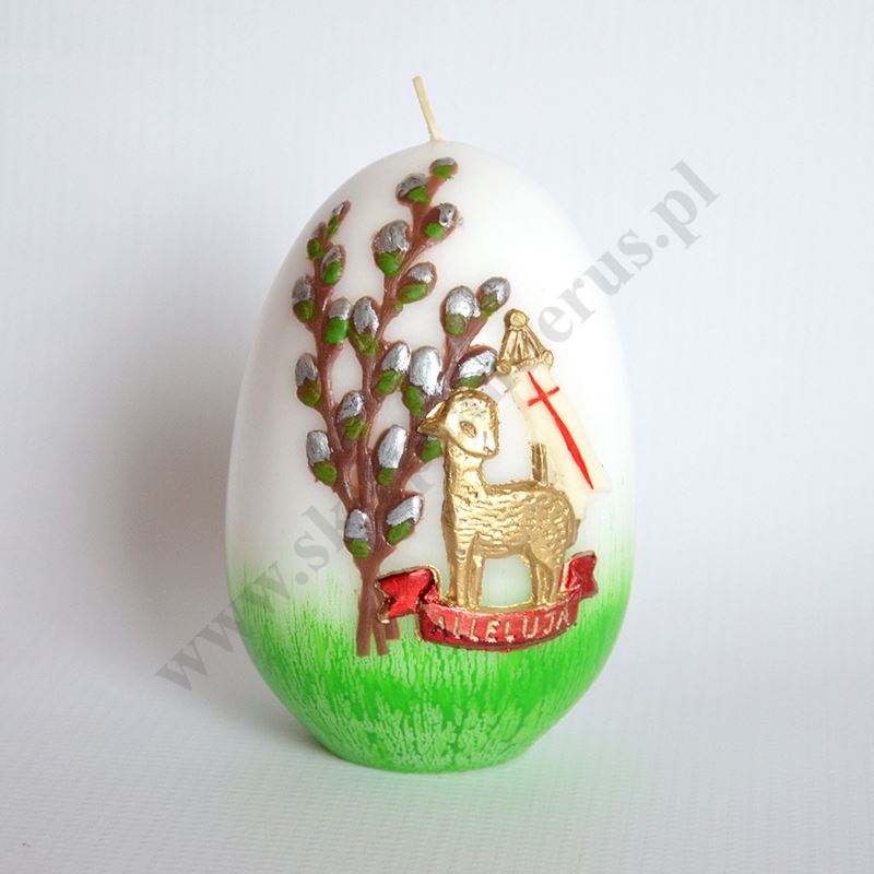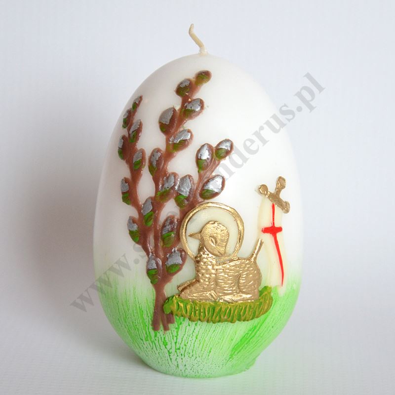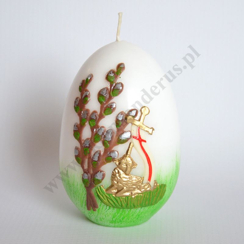 Świeca pisanka zdobiona przestrzenną aplikacją. Wysokość świecy 12 cm, średnica 7.5 cm. Sprzedaż w miksie wzorów.