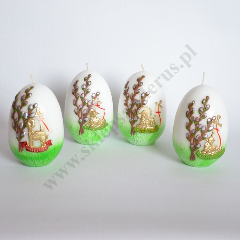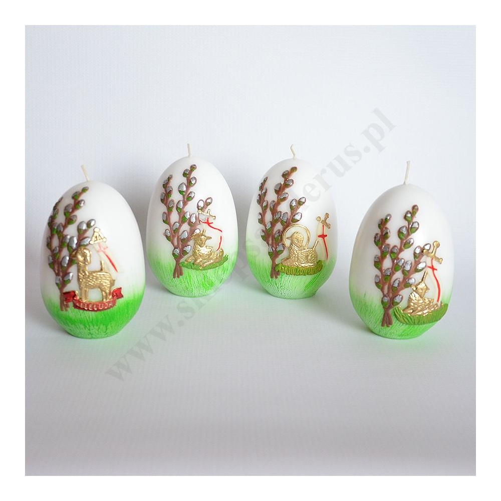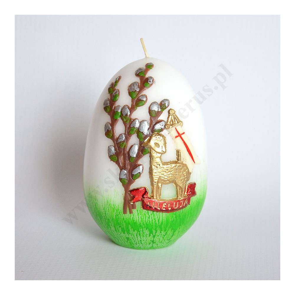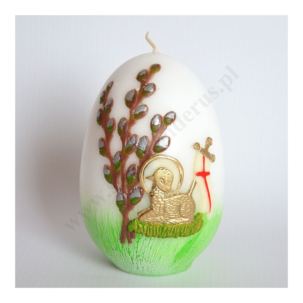 Świeca pisanka zdobiona przestrzenną aplikacją. Wysokość świecy 12 cm, średnica 7.5 cm. Sprzedaż w miksie wzorów.