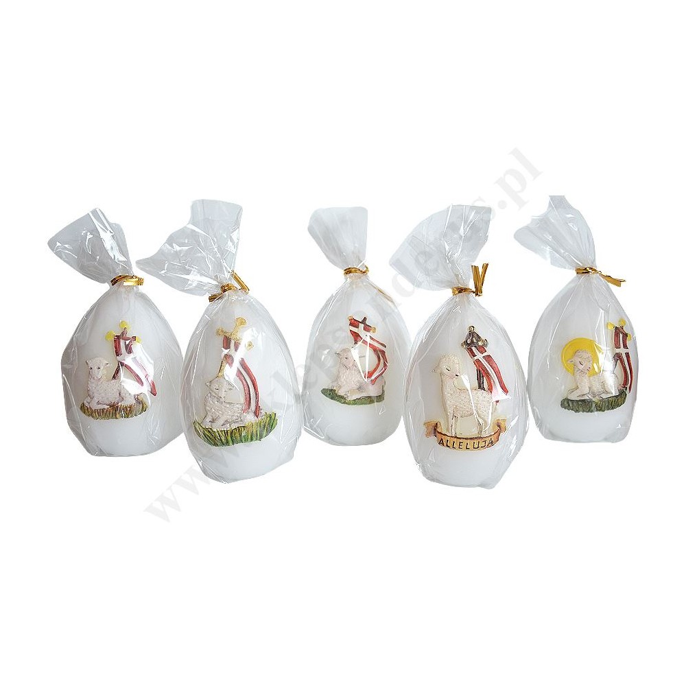 Świeca wielkanocna w kształcie jajka o wysokości 9 cm, zdobiona wielkanocymi aplikacjami. Sprzedaż w miksie wzorów.