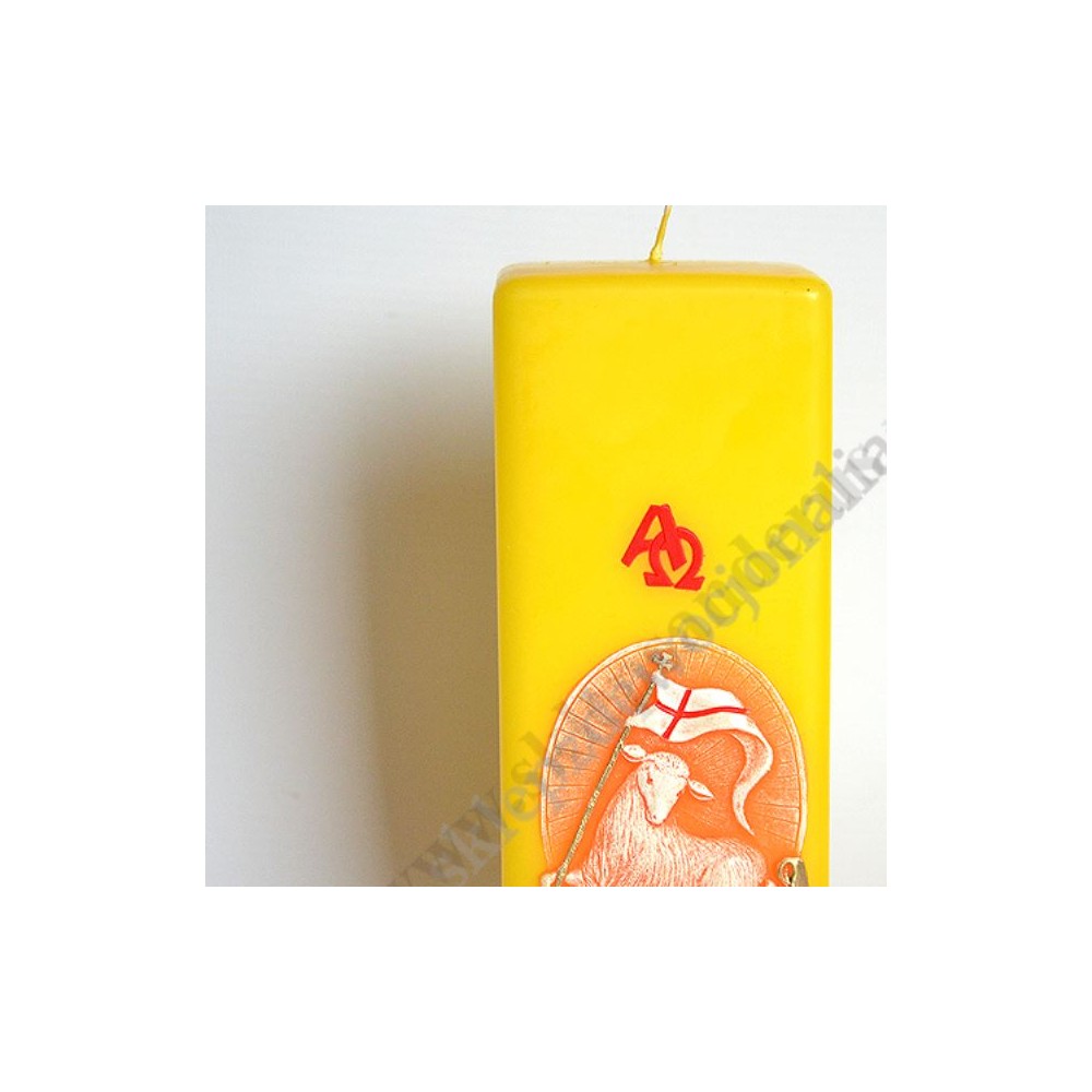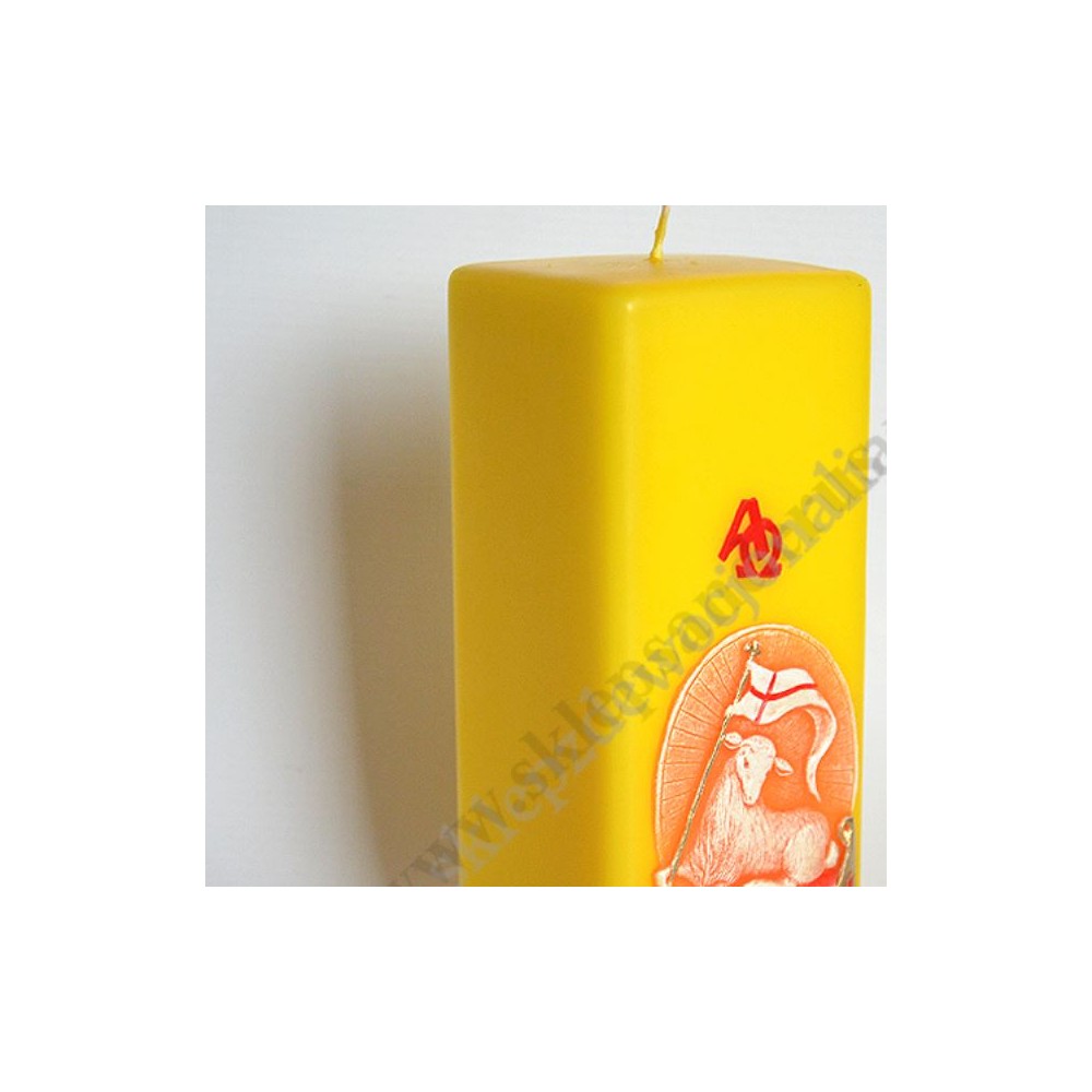 Świeca wielkanocna, parafinowa o wysokości 17 cm i szerokości 7 cm z parafinową, przestrzenną aplikacją wielkanocnego baranka.