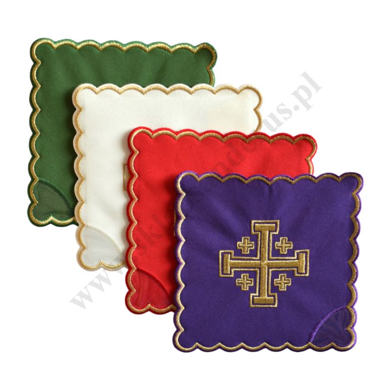 Komplet czterech palek kielichowych w kolorach zielonym, białym, czerwonym i fioletowym z wyhaftowanym motywem krzyża. Dodatkowo jeden z rogów palki zabezpieczono folią ułatwiającą dłuższe utrzymanie w czystości. Wymiar palki 16.5 x 16.5 cm.