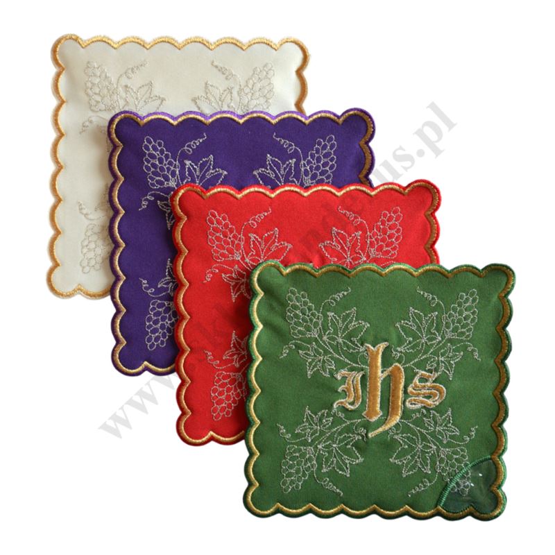 Komplet czterech palek kielichowych w kolorach zielonym, białym, czerwonym i fioletowym z wyhaftowanym motywem IHS. Dodatkowo jeden z rogów palki zabezpieczono folią ułatwiającą dłuższe utrzymanie w czystości. Wymiar palki 16.5 x 16.5 cm.