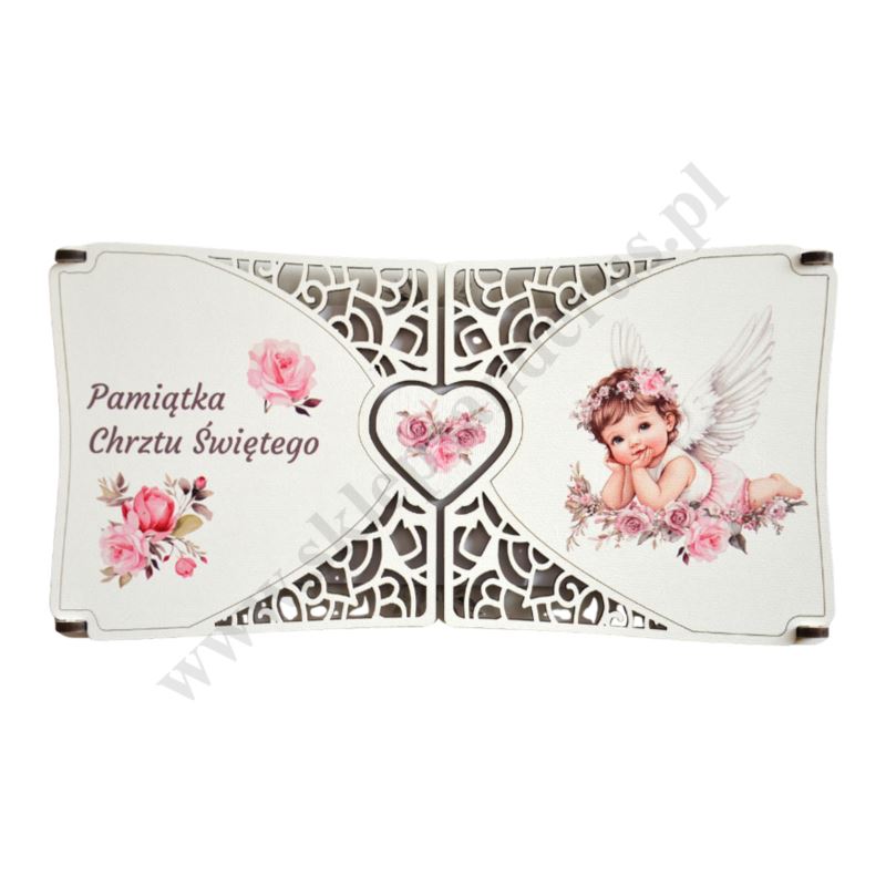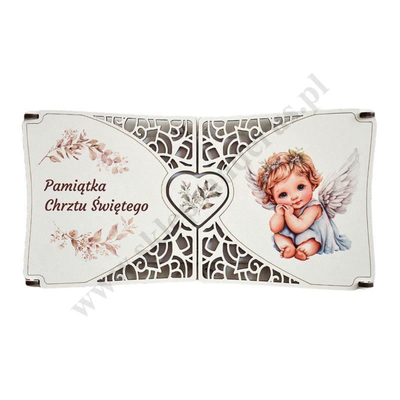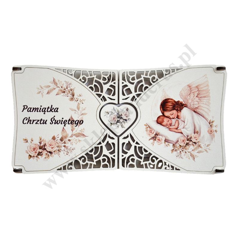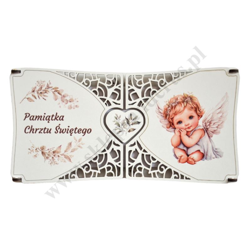 Pamiątka Chrztu Świętego w formacie 22 x 11.5 cm wykonana ze sklejki. Sprzedaż w miksie wzorów.