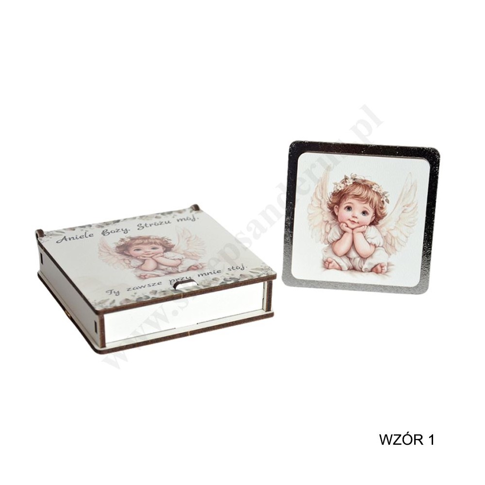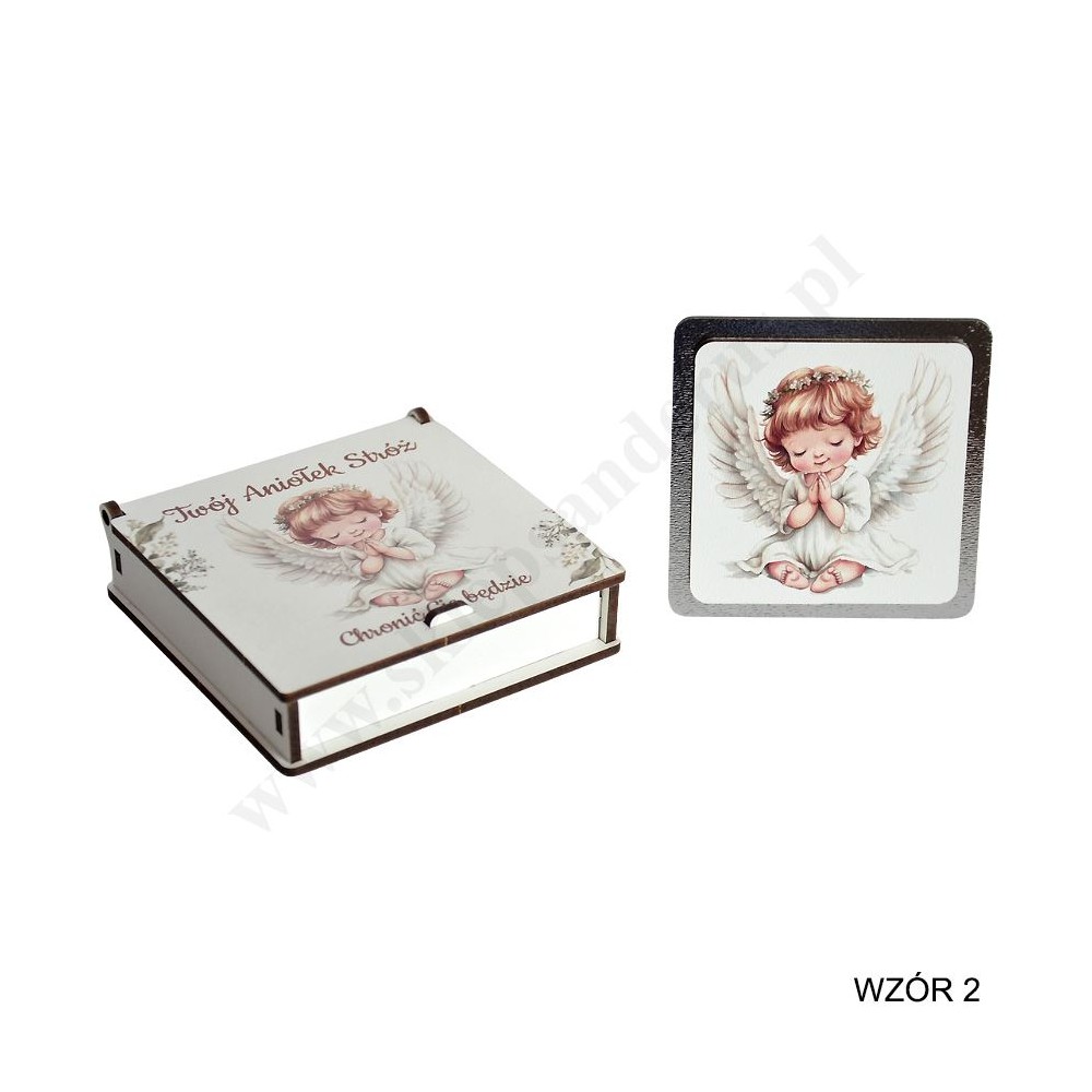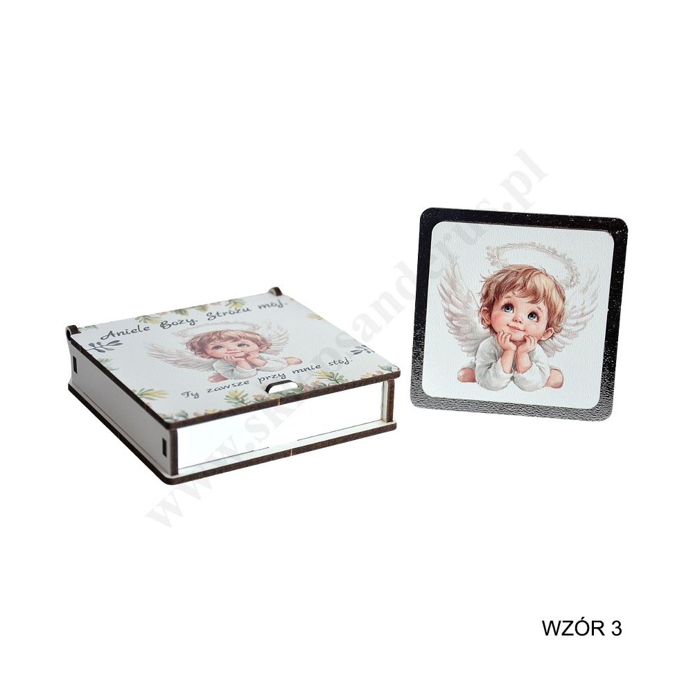 Pamiątka Chrztu Świętego w postaci obrazka do postawienia przedstawiającego aniołka w pudełeczku wykonanym ze sklejki. Wymiary obrazka 7.8 x 7.8 cm, wymiary pudełeczka 9.5 x 9.5 x 2.4 cm.