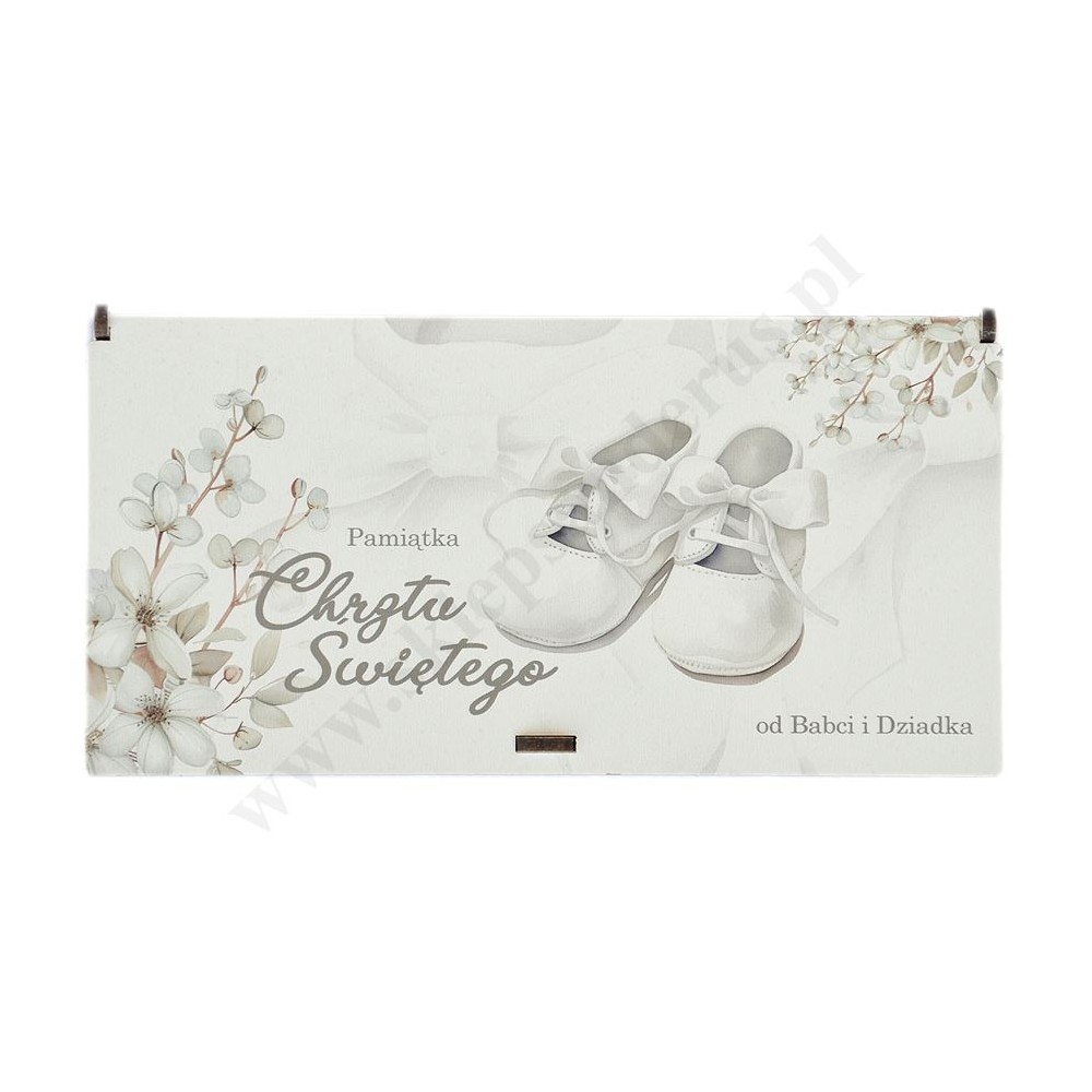 Pudełeczko upominkowe z okazji Chrztu Świętego od Babci i Dziadka w wymiarze 19 x 9.5 x 2.3 cm wykonane z grawerskiej sklejki wraz z okazyjną kartką w środku z dedykacją z okazji Chrztu Świętego.