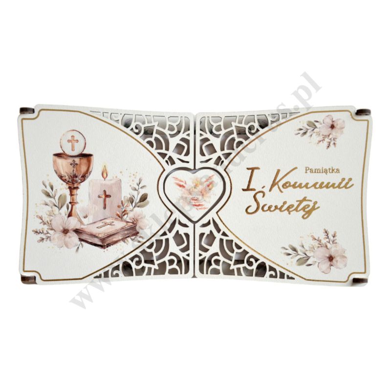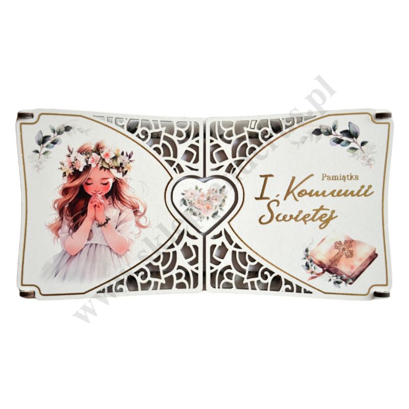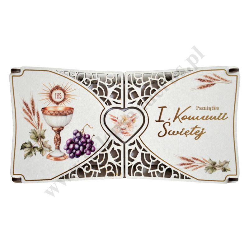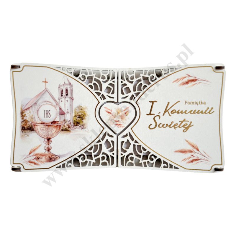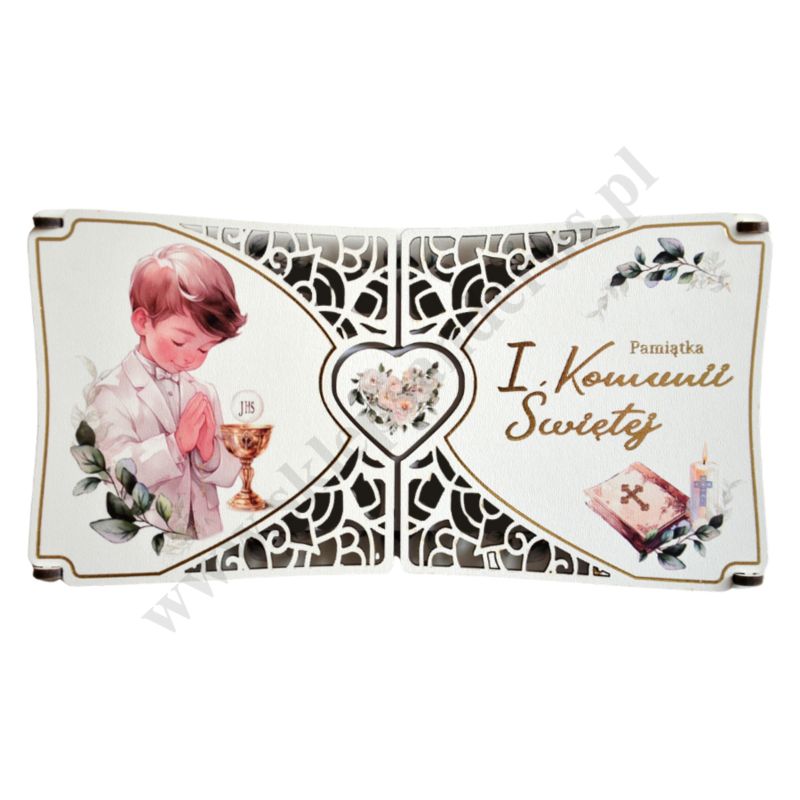 Pamiątka I Komunii Świętej wykonana ze sklejki, format 22.3 x 11.5 cm. Sprzedaż w miksie wzorów.