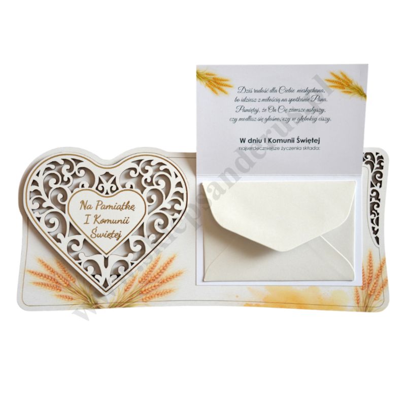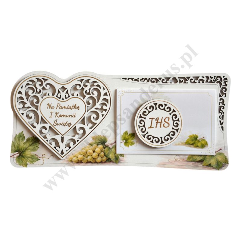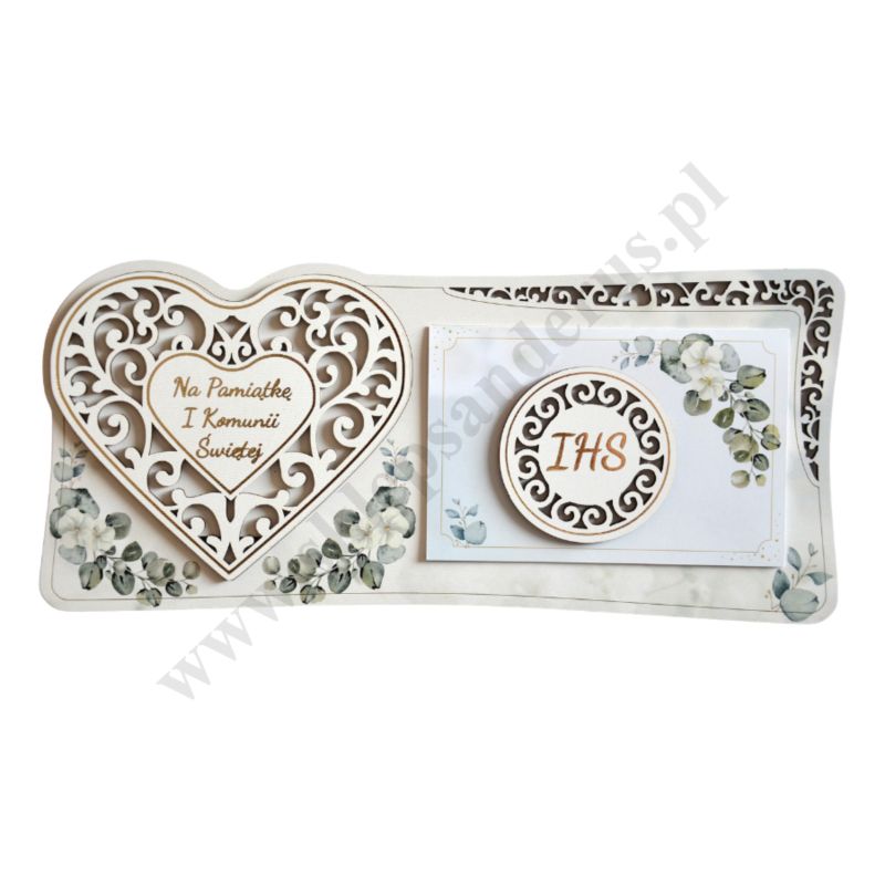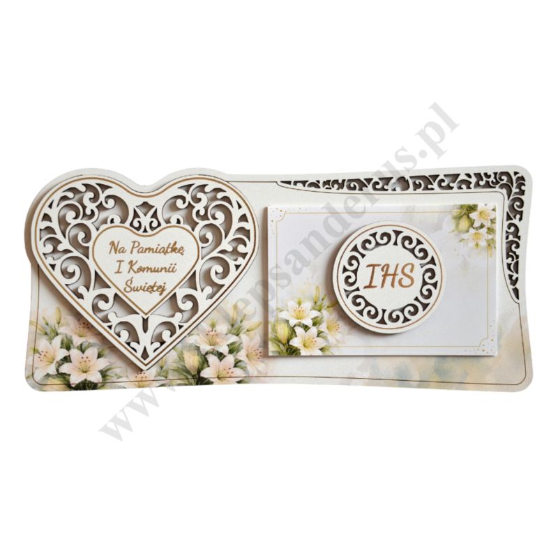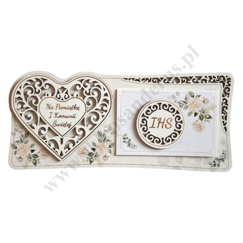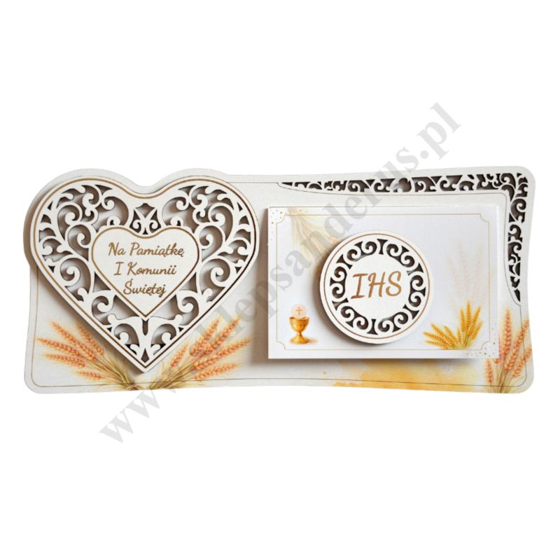 Pamiątka I Komunii Świętej wykonana ze sklejki, format 26.8 x 12 cm. Sprzedaż w miksie wzorów.