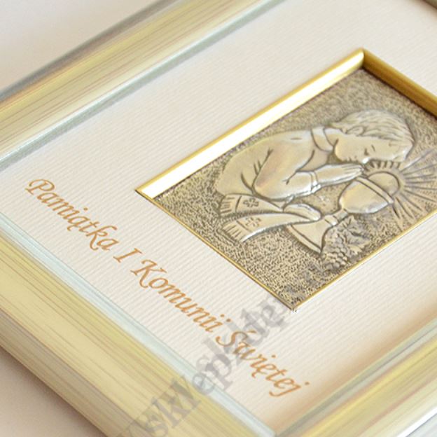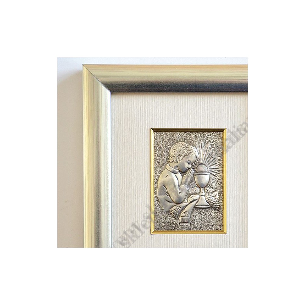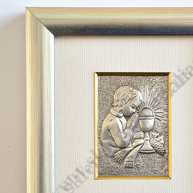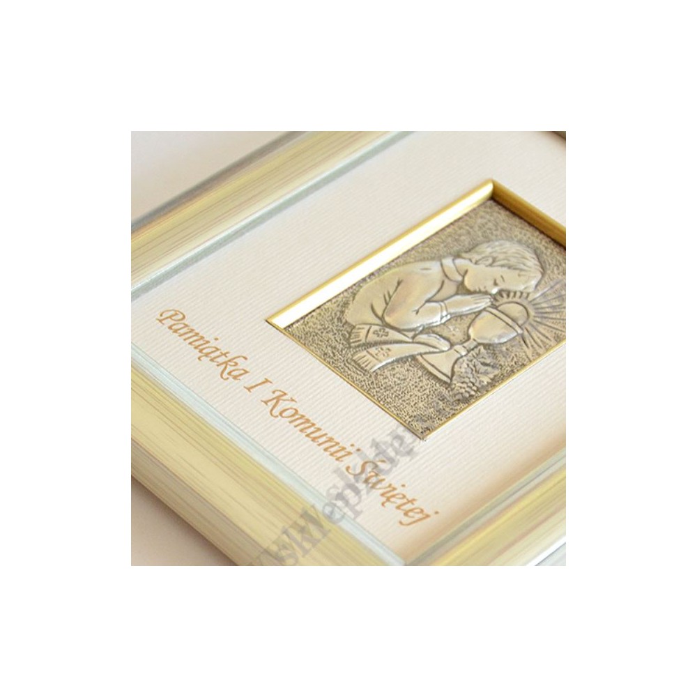 Pamiątka I Komunii Świętej w postaci obrazka w formacie 12.6 cm x 14.5 cm wykonany w metaloplastyce za szybą w drewnianej ramie. PONIŻEJ W PRODUKTACH POWIĄZANYCH ISTNIEJE MOŻLIWOŚĆ ZAMÓWIENIA OKAZJONALNEJ DEDYKACJI NA SPECJALNEJ TABLICZCE.