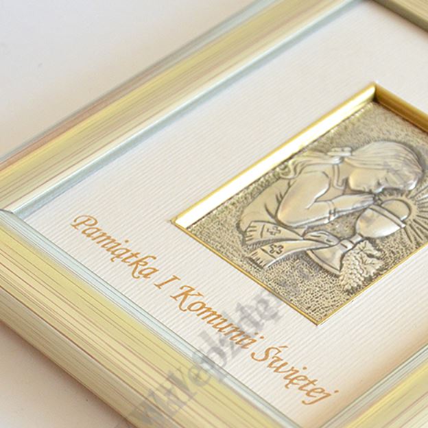 Pamiątka I Komunii Świętej w postaci obrazka w formacie 12.6 cm x 14.5 cm wykonany w metaloplastyce za szybą w drewnianej ramie. PONIŻEJ W PRODUKTACH POWIĄZANYCH ISTNIEJE MOŻLIWOŚĆ ZAMÓWIENIA OKAZJONALNEJ DEDYKACJI NA SPECJALNEJ TABLICZCE.