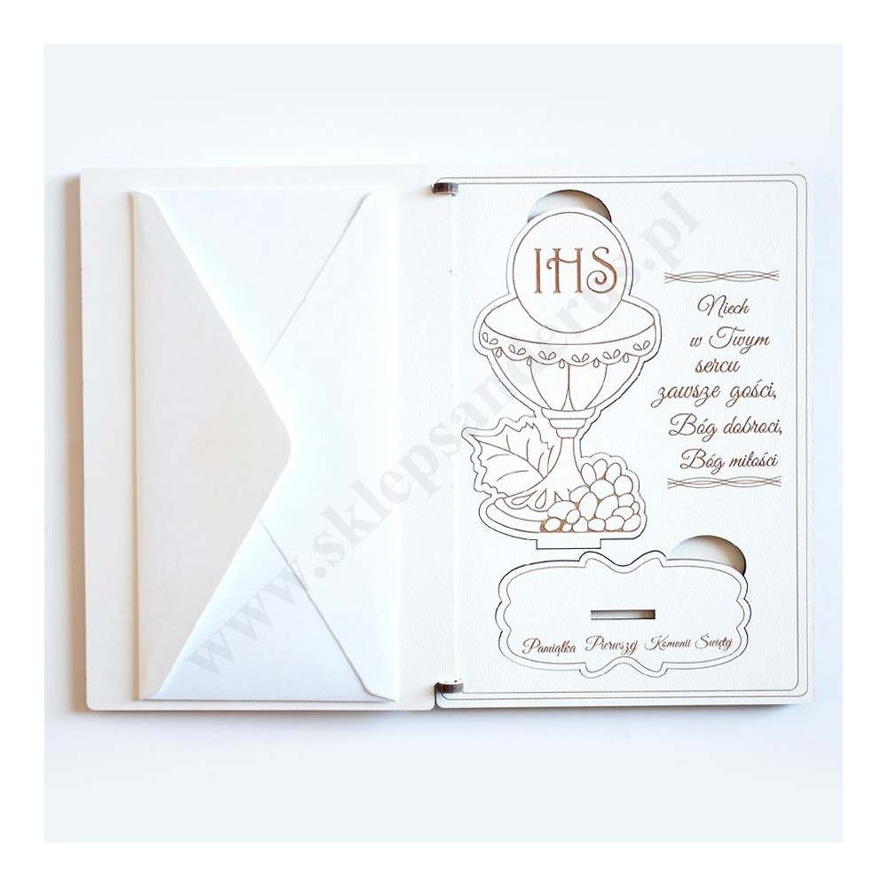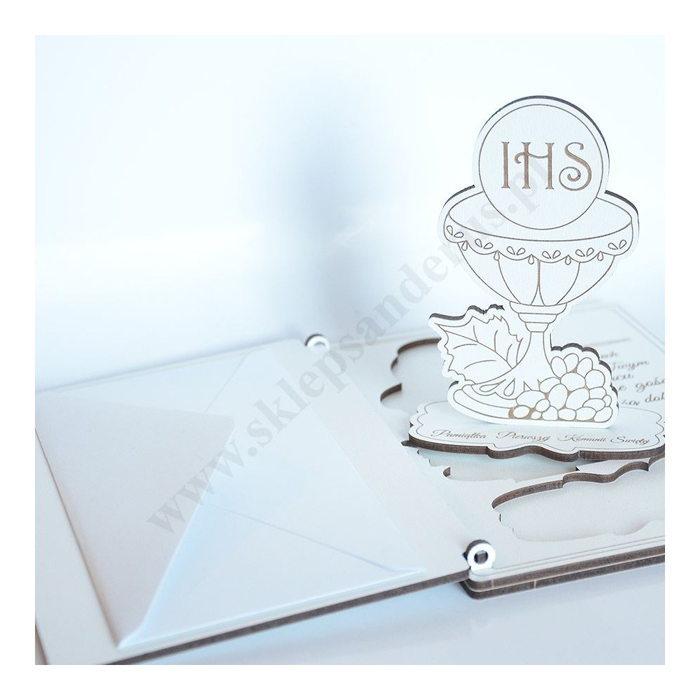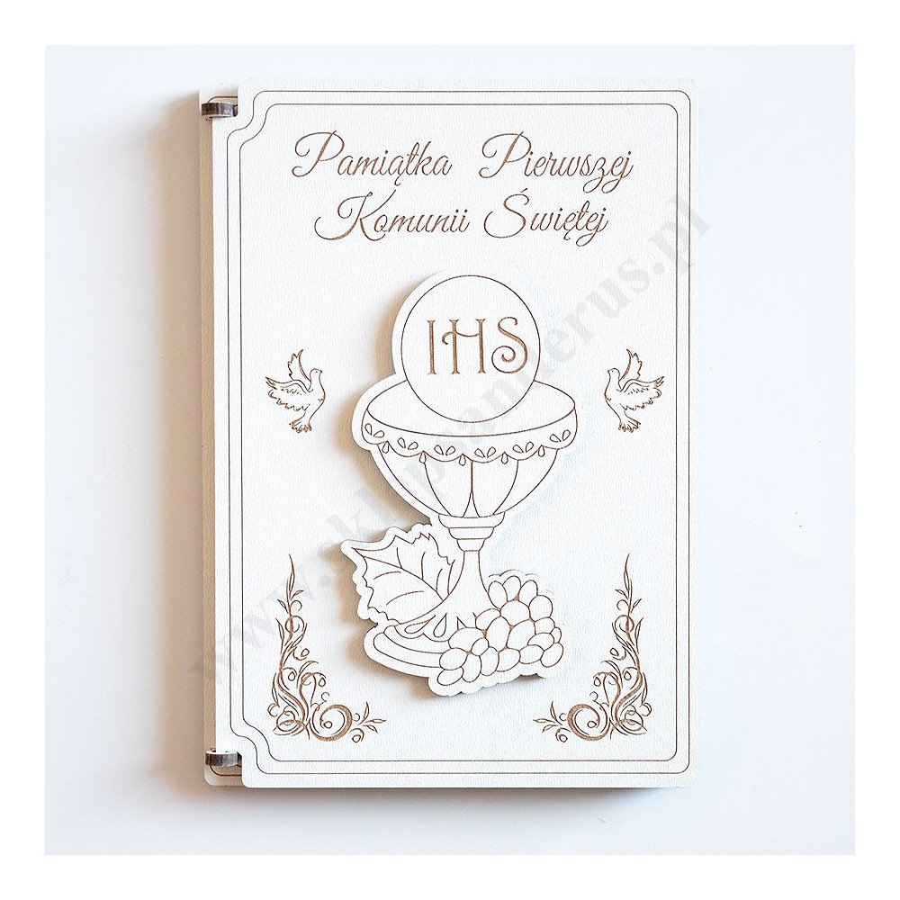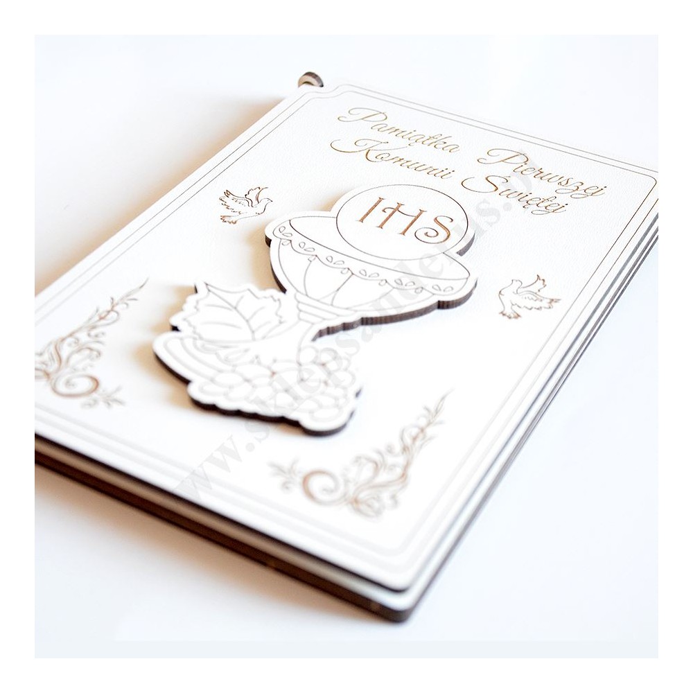 Pamiątka I Komunii Świętej w formacie 12 x 17 cm wykonana w drewnopodobnym materiale HDF z upominkiem w postaci składanej statuetki kielicha eucharystycznego.