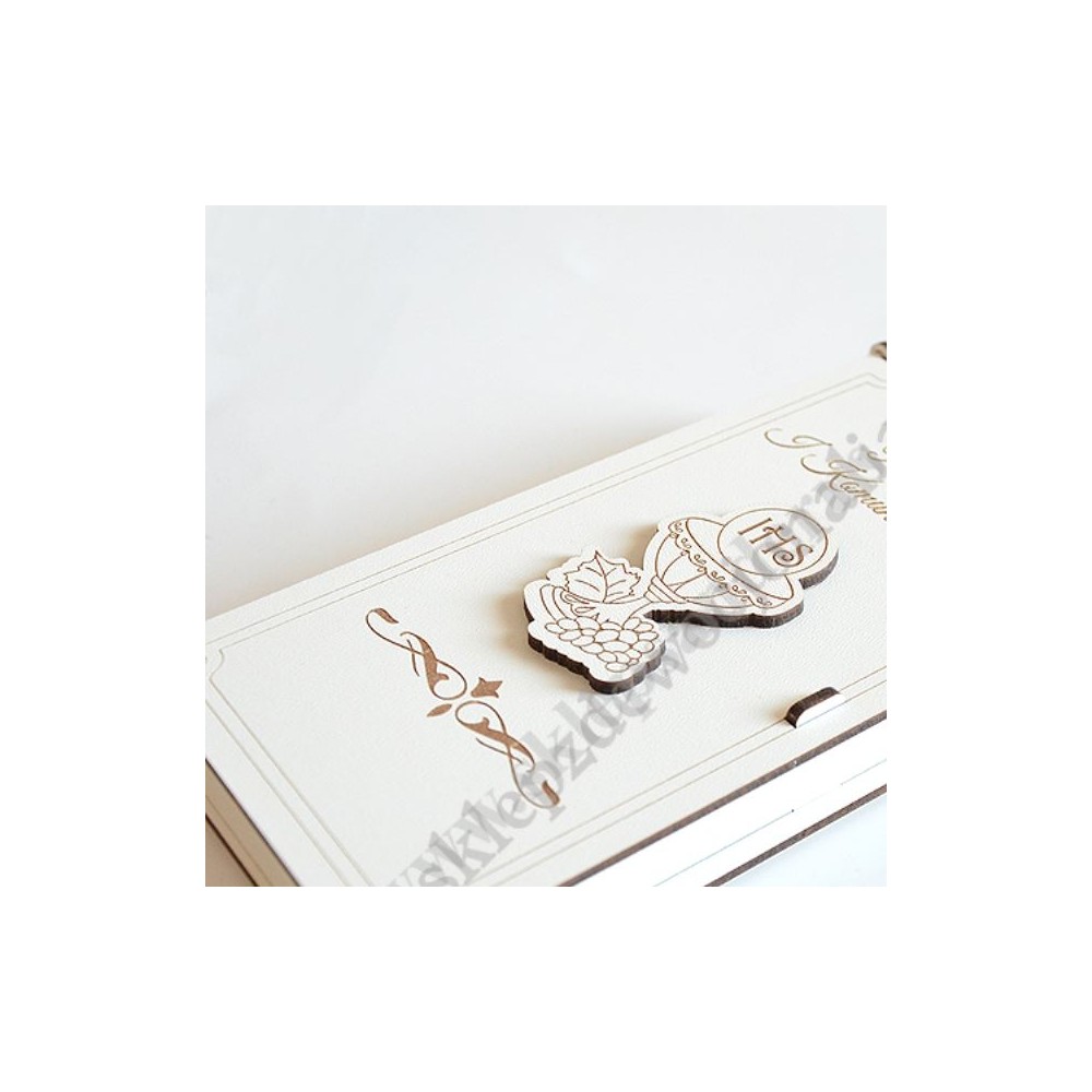 Pamiątkowe drewniane pudełeczko z pamiątką Pierwszej Komunii Świętej w środku.