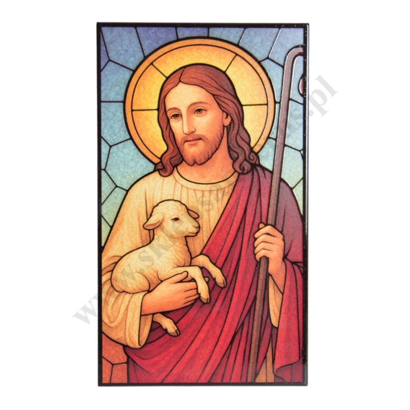 Obrazek Pana Jezusa Dobrego Pasterza wykonany techniką nadruku na drewnie, dodatkowo lakierowany. Format obrazka 10 x 19 x 1 cm. Obrazek do postawienie lub powieszenia.