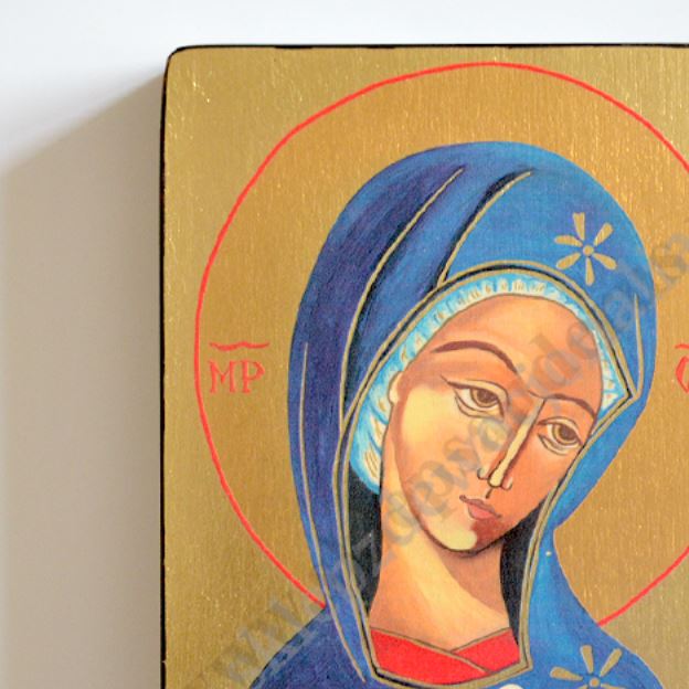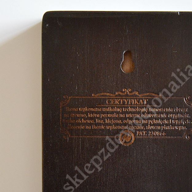 Prezentowana ikona wykonana jest unikalną techniką nanoszenia obrazu na drewno. Nadruk wyróżnia się głębią koloru oraz charakterystycznymi wklęsłymi złoceniami.