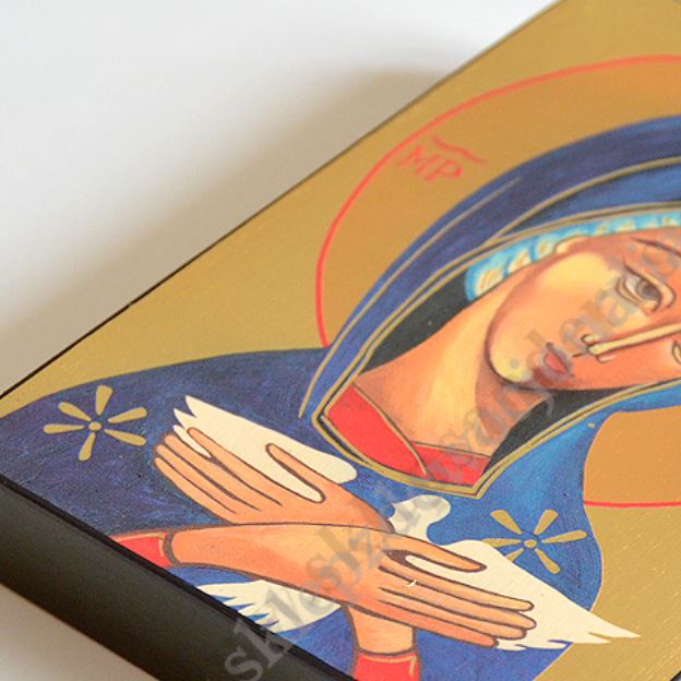 Ikona Matki Bożej z Duchem Świętym o wymiarch 12 cm x 16 cm wykonana jest unikalną techniką nanoszenia obrazu na drewno. PONIŻEJ W PRODUKTACH POWIĄZANYCH ISTNIEJE MOŻLIWOŚĆ ZAMÓWIENIA OKAZJONALNEJ DEDYKACJI NA TABLICZCE SREBRNEJ LUB ZŁOTEJ.