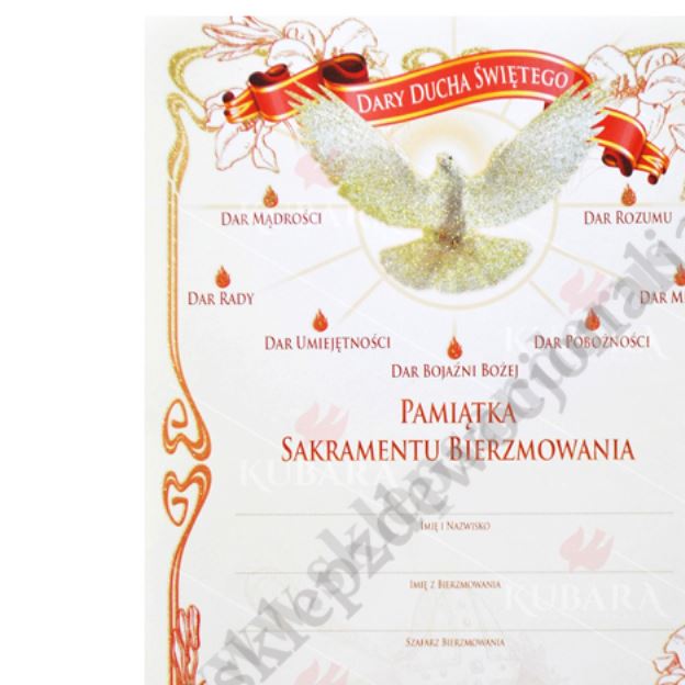 Pamiątka Sakramentu Bierzmowania w formacie 15.5 x 22 cm. Papier kredowy 300g.