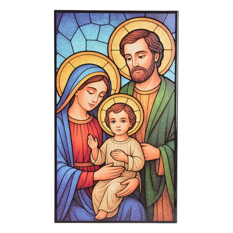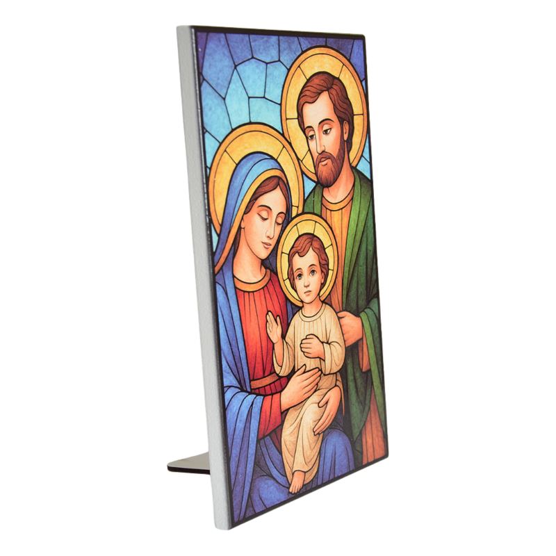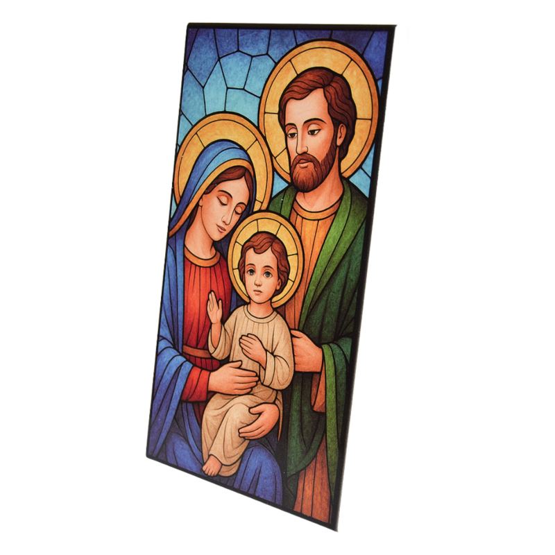 Obrazek Świętej Rodziny wykonany techniką nadruku na drewnie, dodatkowo lakierowany. Format obrazka 14 x 24 x 1 cm. Obrazek do postawienie lub powieszenia.