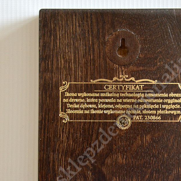 Ikona wykonana unikalną technologią nanoszenia obrazu na drewno, która pozwala na wierne odtworzenie oryginału. Deska olchowa, lita klejona, odporna na pęknięcia i wygięcia. Złocenia na ikonie wykonane ręcznie, złotem płatkowym.