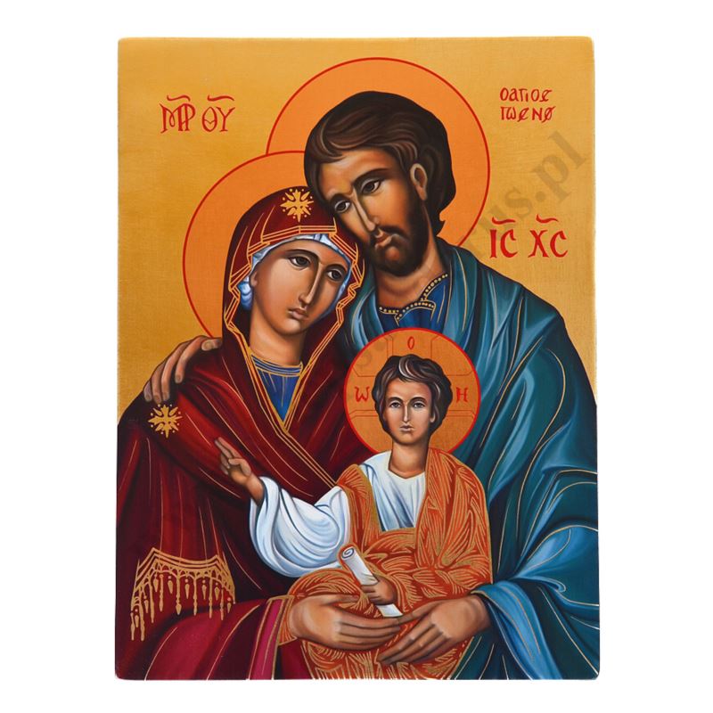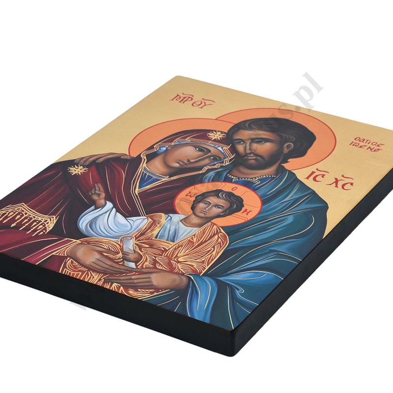 Ikona Świętej Rodziny o wymiarze 29 x 39 cm i grubości 2.6 cm. PONIŻEJ W PRODUKTACH POWIĄZANYCH ISTNIEJE MOŻLIWOŚĆ ZAMÓWIENIA OKAZJONALNEJ DEDYKACJI NA TABLICZCE SREBRNEJ LUB ZŁOTEJ.