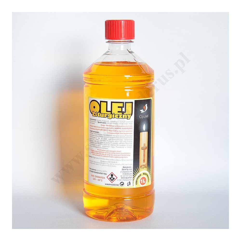 Olej parafinowy o kolorze żółtym o pojemności 1 L do świec liturgicznych, pochodni oraz zwykłych i ozdobnych lamp naftowych. Posiada certyfikat bezdymności.