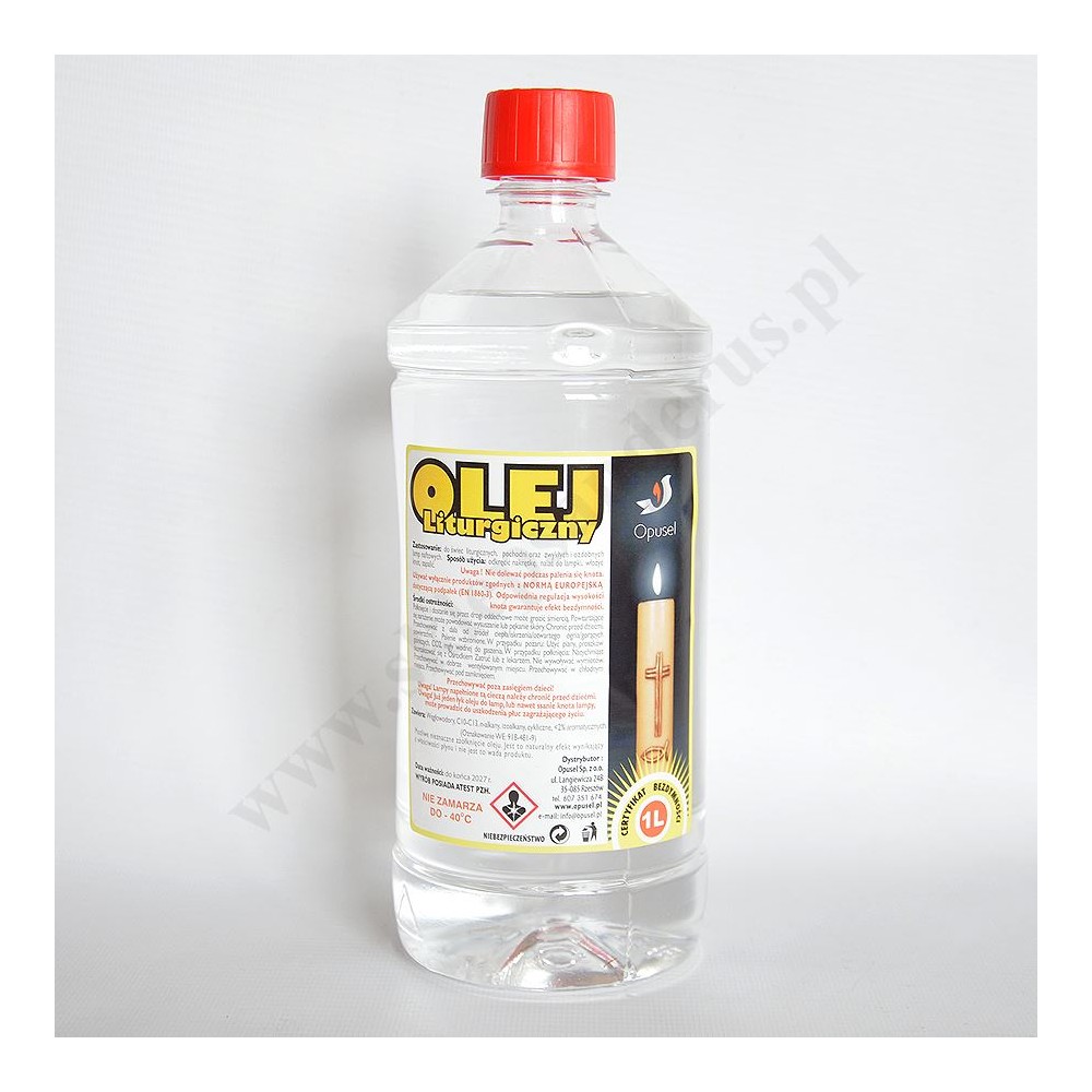 Olej parafinowy o pojemności 1 L do świec liturgicznych, pochodni oraz zwykłych i ozdobnych lamp naftowych. Posiada certfikat bezdymności.
