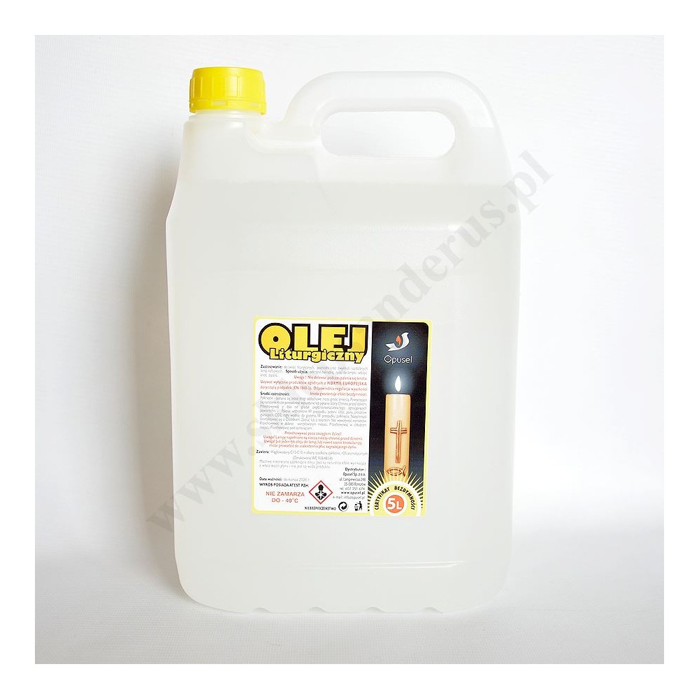Olej parafinowy o pojemności 5 L do świec liturgicznych, pochodni oraz zwykłych i ozdobnych lamp naftowych. Posiada certfikat bezdymności.