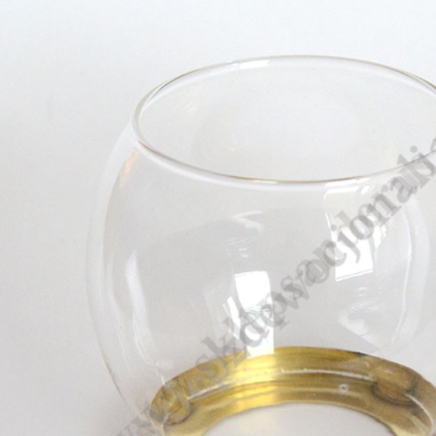 Szklana osłonka na świece olejową, średnica otworu na wkład olejowy 4.5 cm. Wysokość osłonki 8 cm, średnica w podstawie 6.7 cm, średnica w najszerszym miejscu 9 cm.