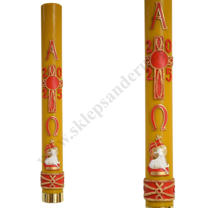 Paschał olejowy oblewany woskiem zdobiony przestrzenną, parafinową aplikacją. Wysokość paschału 100 cm i średnica 10 cm. W komplecie znajdują się grona. Paschał nie posiada wkładu olejowego.
